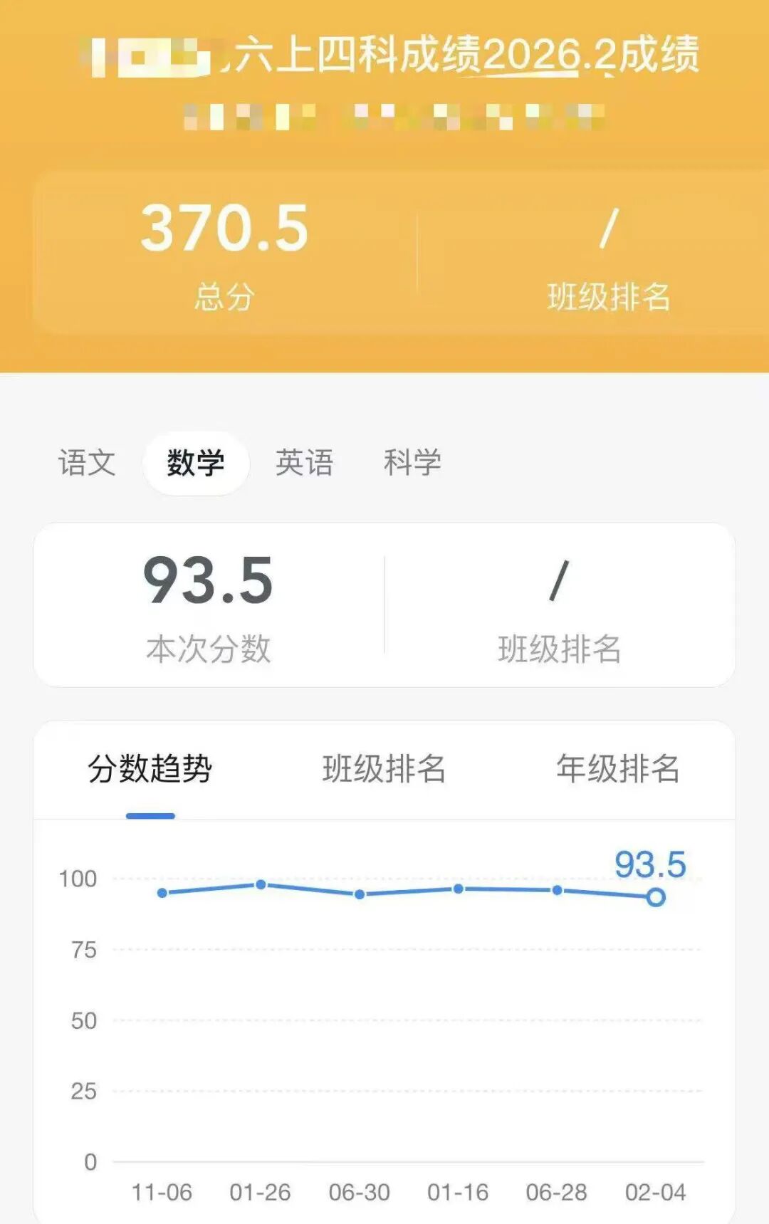 “我儿子除了五年级下期末考试数学考了98分,其余没有一门课是超过95分,那次期末考完,我家跟过年了一样!”金女士说,“98分也给了孩子很大的信心,他自认为自己数学是有优势的,结果这次数学考了93.5分,而中位分是96分,连中位分都没达到,我都不知道怎么跟数学老师反馈。”