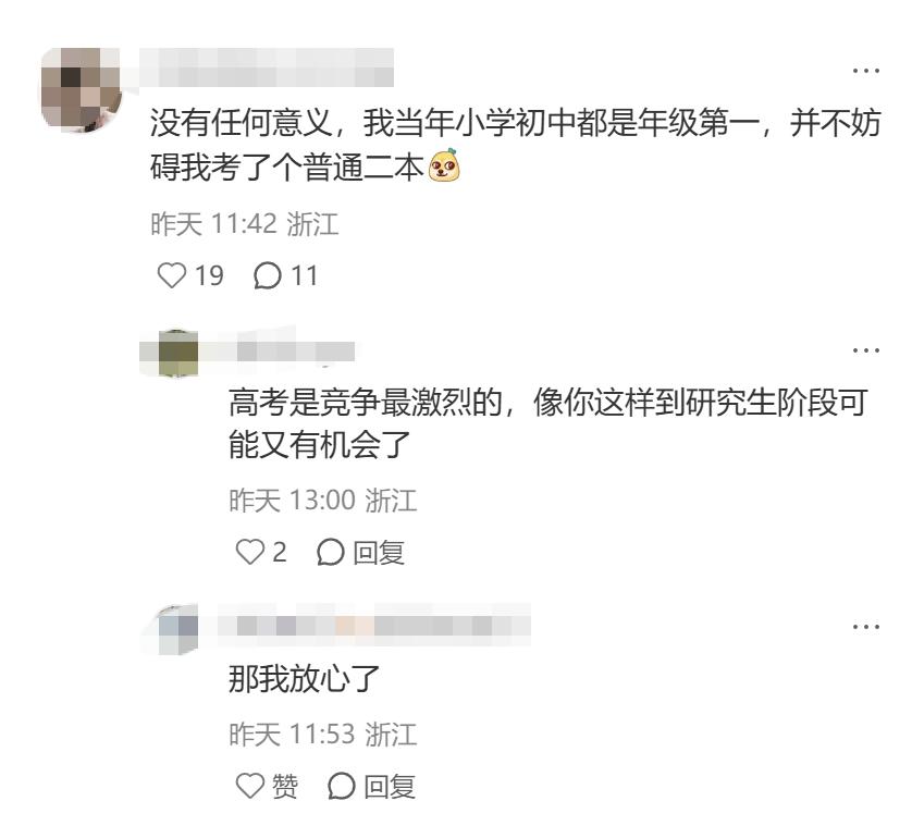 有网友调侃,小学阶段的成绩没有任何意义,“我当年小学初中都是年级第一,并不妨碍我考了个普通二本。”