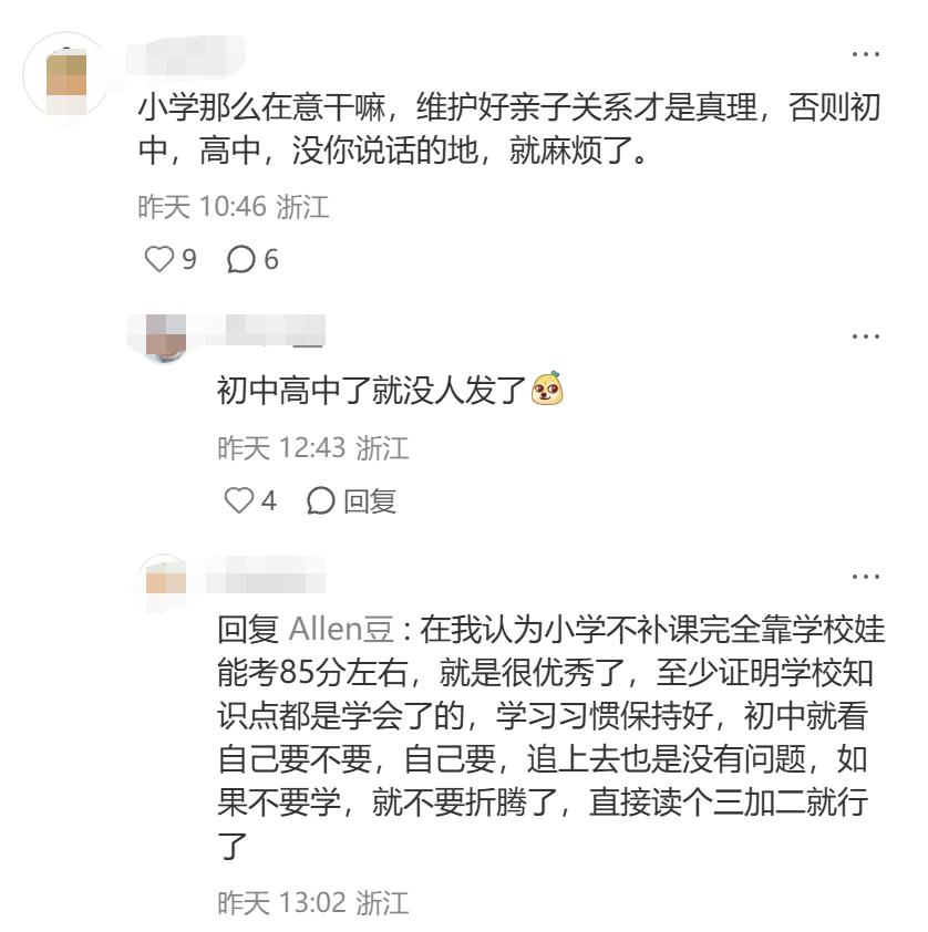 “维护好亲子关系+养成好的学习习惯,才是小学阶段家长们最应该关心的事。不要太纠结孩子一次两次的考试成绩,尤其对于孩子的进步,家长一定要及时给与正向的鼓励和支持。”这位家长的留言引发了诸多点赞。