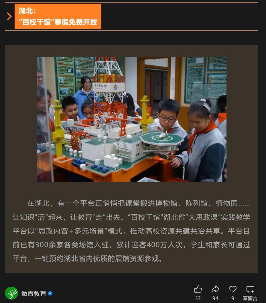 日前,教育部官微聚焦“安全快乐过寒假”的主题,推介了湖北“百校千馆”等五省丰富学生寒假生活的举措。“百校千馆”平台是由湖北省委宣传部、省委网信办、省委教育工委、省教育厅统筹指导,依托新闻建设的湖北省“大思政课”实践教学平台。