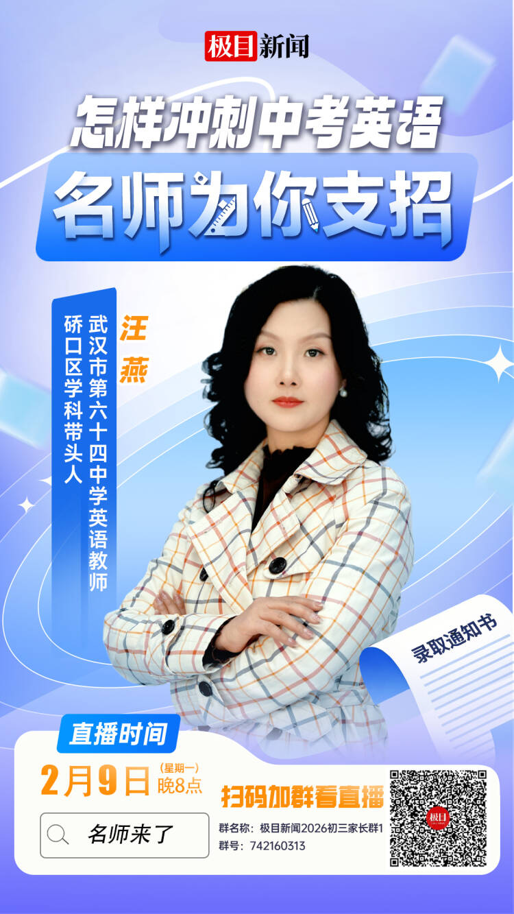 今晚(2月9日),“名师来了·冲刺中考”将推出英语学科专场节目。主讲嘉宾武汉市第六十四中学英语教师、武汉市优秀班主任、硚口区英语学科带头人汪燕老师,将结合近年武汉中考命题规律、教材核心考点及教学实践经验,从备考核心思路、板块突破技巧、分阶段规划、家校协同要点等方面,为考生和家长送上“提分锦囊”。
