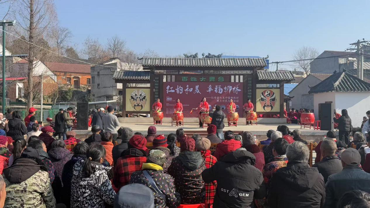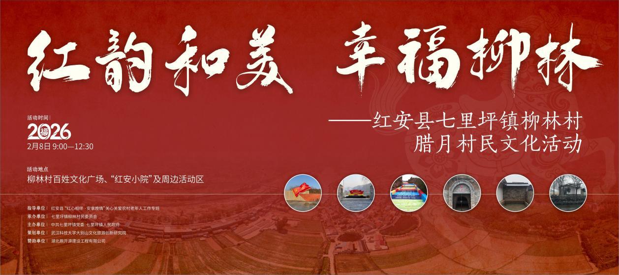 2026年2月8日(农历腊月廿一),冬日暖阳洒在红安县七里坪镇柳林村的青山绿水间。上午9点,柳林村百姓文化广场、“红安小院”及周边区域,早已是欢声笑语、人头攒动。一场以“红韵和美 幸福柳林”为主题的腊月村民文化活动在这里隆重举行。活动由中共七里坪镇党委、七里坪镇人民政府主办,柳林村民委员会承办,在红安县“红心相伴·安享晚情”关心关爱农村老年人工作专班的指导下,由武汉科技大学大别山文化旅游创新研究院精心策划。县、镇有关领导,本地乡贤,大中小学生代表及村民数百人齐聚一堂,共同参与这场集文化传承、敬老爱老、代际融合、乡贤聚力于一体的乡村盛会,在农历新年即将到来之际,绘就了一幅红色底蕴与和美新风交织的动人画卷。