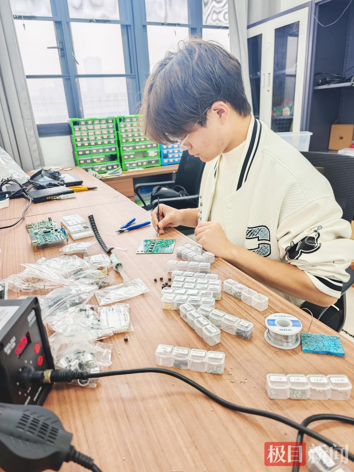 图为赵双明正在为“蓝桥杯”比赛自制电路板 摄影:薛莲