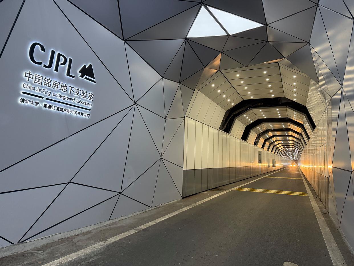 不多时,车子便一头扎进了锦屏山隧道。这是一条长17.5千米的交通隧洞,依锦屏水电站而建。地下实验室就在这条隧道的中部,深藏于山体覆盖厚达2400米的“极深地下”。那里宇宙线通量只有地面的一亿分之一,是全世界最“纯净”的深地实验室。