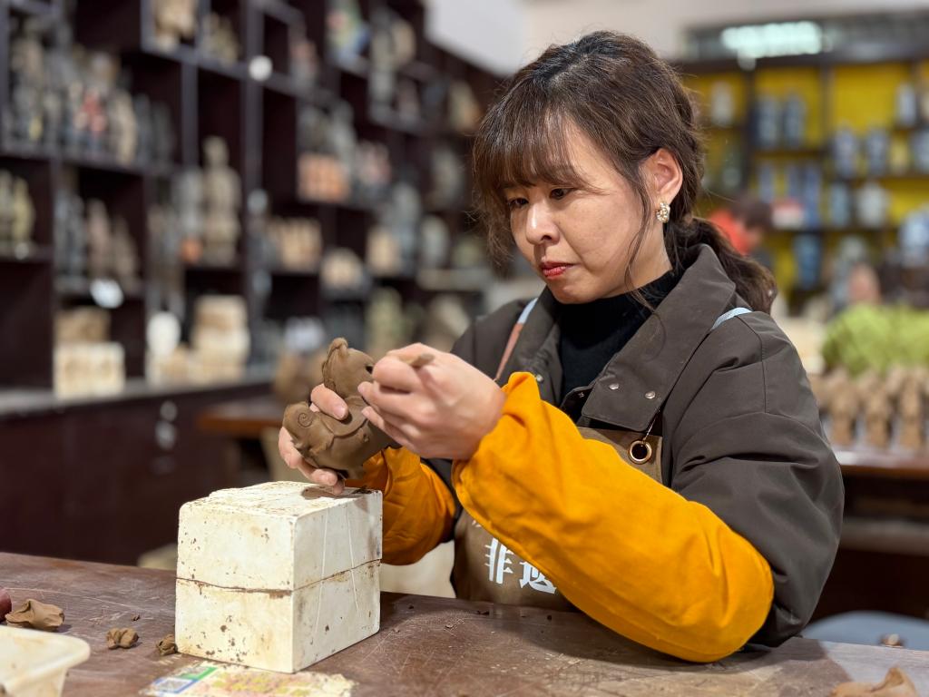 接待完研学团,传习所安静下来。韩咪回到工作台前,取出一块泥条揉搓好,填进模具。两三分钟后,一匹身材浑圆的小马从模具中“跃然而出”。她拿起竹刀,修去余泥,小马娇憨的神态渐渐清晰。这是她为马年设计的“驻福马”,意为“停下来享受片刻轻松”。