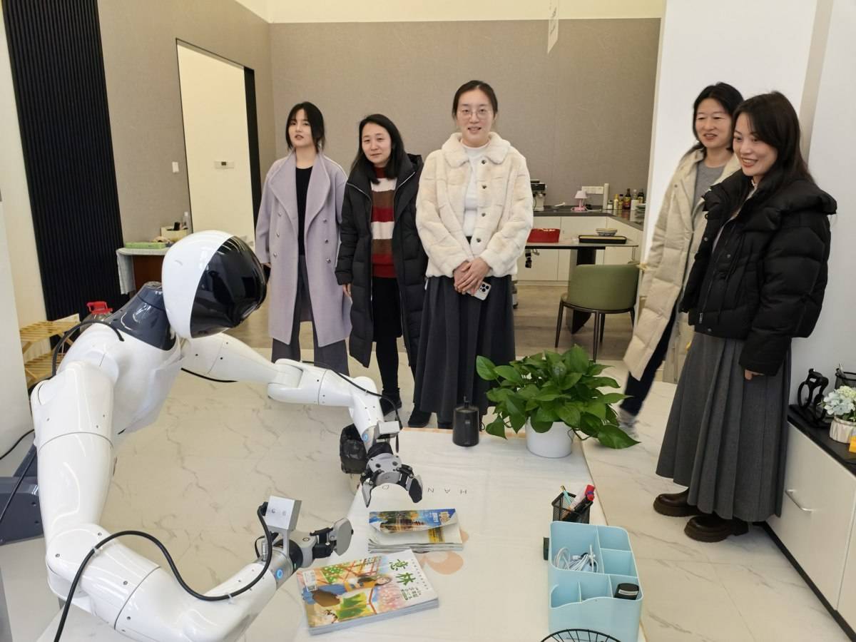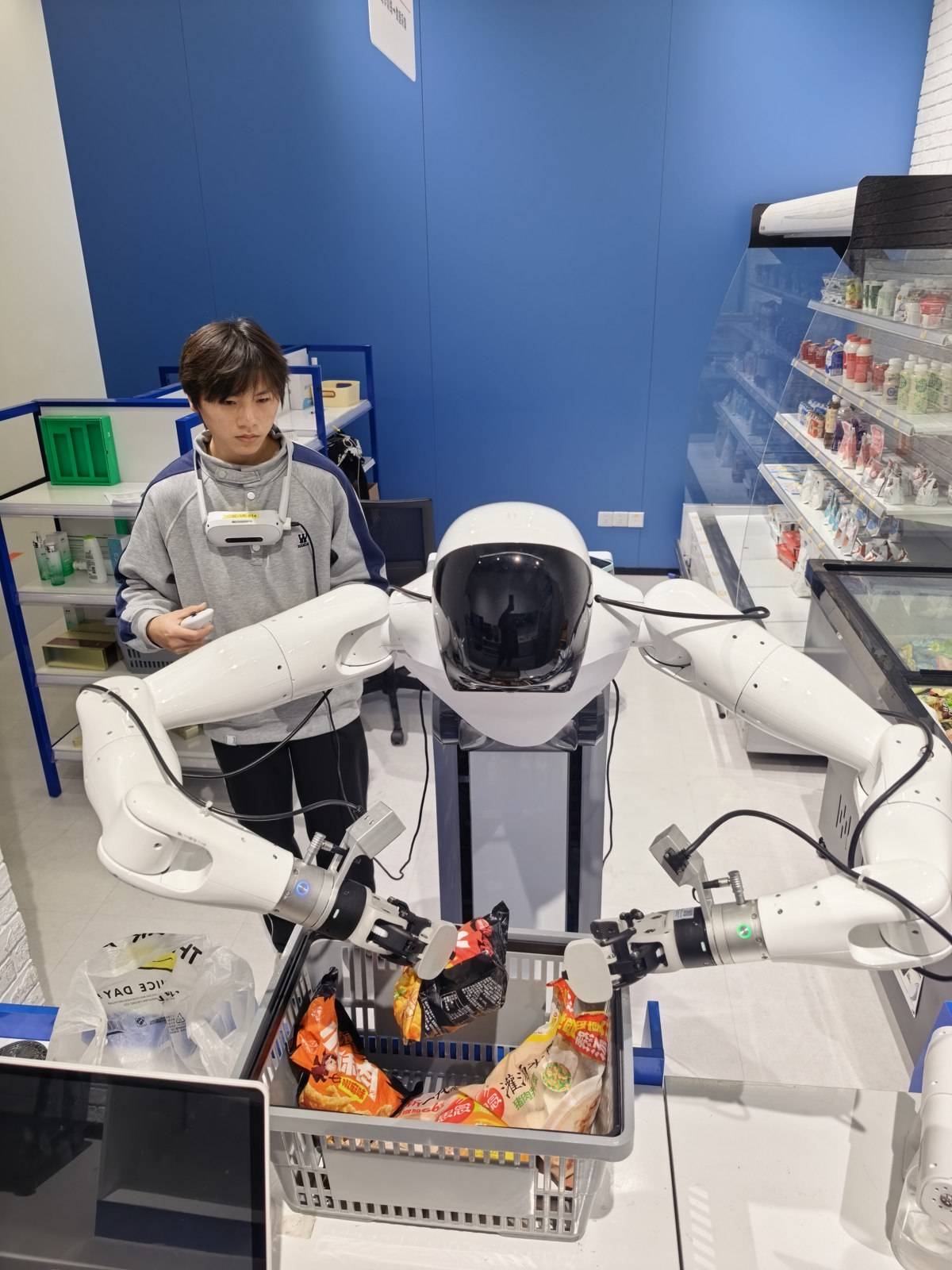 一勺,两勺……灵巧手将猫盒子打开,捏着小勺子,铲出四勺猫粮,恰好是猫咪一餐的食量。“用时1分钟,达标了!”一位训练人形机器人的女生指挥着人形机器人喂食猫咪,她在这里实习快一个月,每天重复着数十组的训练任务,就像教会蹒跚学步的幼儿。