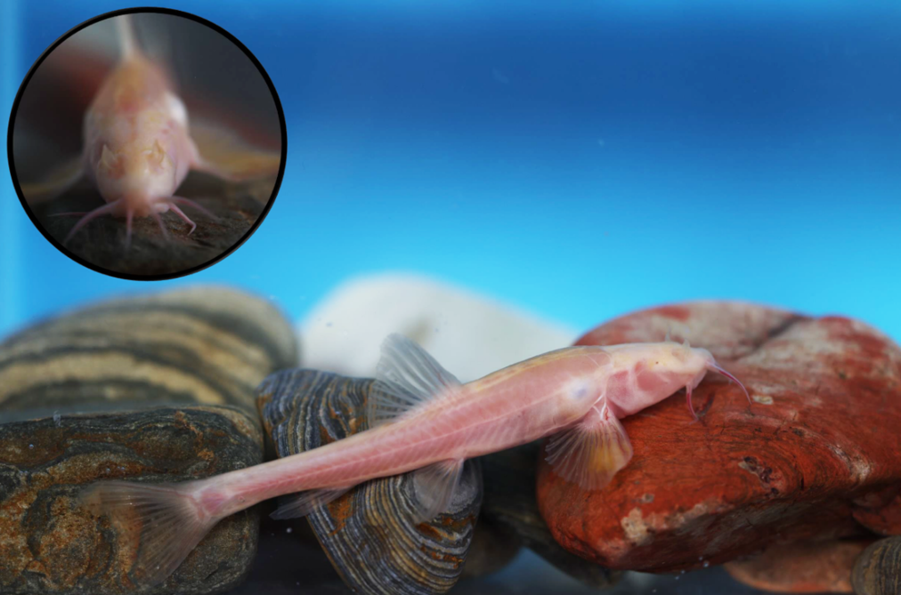 这是“纳雍盲高原鳅”的活体图,其身体呈现透明淡粉色,鳞片消失,眼睛退化为小黑点。(受访者供图)