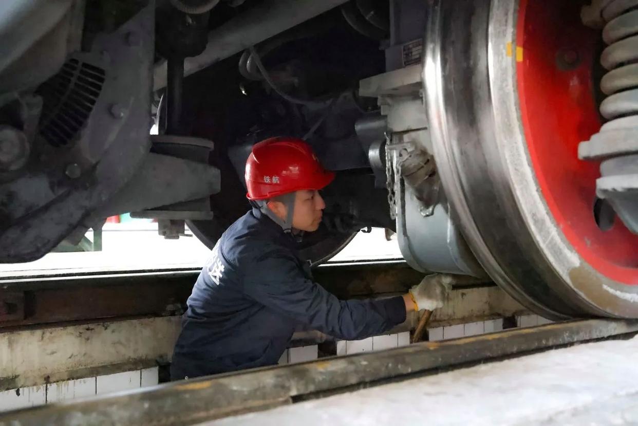 ↑机车检修技师检查机车走行部火箭坐着火车来