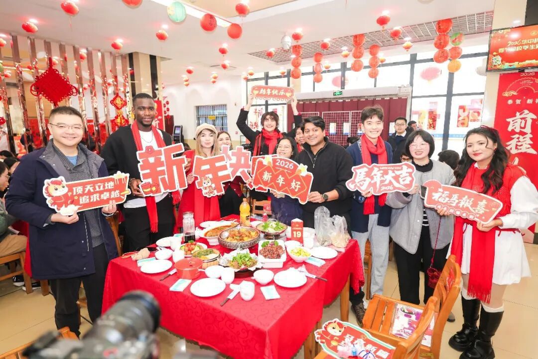 校党委书记刘波、校党委副书记张耀、副校长冯丹与留校师生一同包饺子、话家常,围桌共食、温馨团圆,并为同学们送上新春红包与节日礼包,致以诚挚的新春问候。团年饭以“策马踏春庆团圆”为主题,包含十道热菜、三道主食及汤饮,“金元纳吉”“蒸蒸日上”等菜名满载学校对学子的美好祝愿。