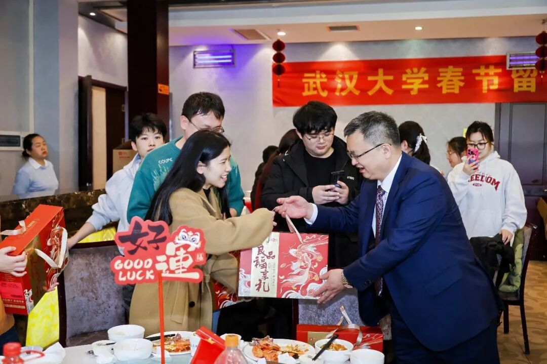 王文起代表学校向留校学生致以新春的诚挚祝福。他说,学校就是同学们的第二个家,希望同学们能感受到家一般的温暖,在校园过一个欢乐、祥和的新年。王文起为同学们发放新年礼包,向同学们送上了“新年快乐”的美好祝愿。一份份满载学校关怀的礼包,让学子们感受到了浓浓的校园温情。