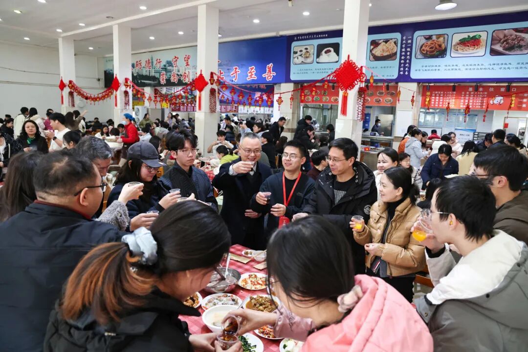 2月11日,南方小年,华中科技大学东一学生食堂张灯结彩,一场特别的“家宴”正在举行。校领导与200余名留校学生欢聚一堂,共迎新春、互送祝福,度过一个温情满满的中国年。