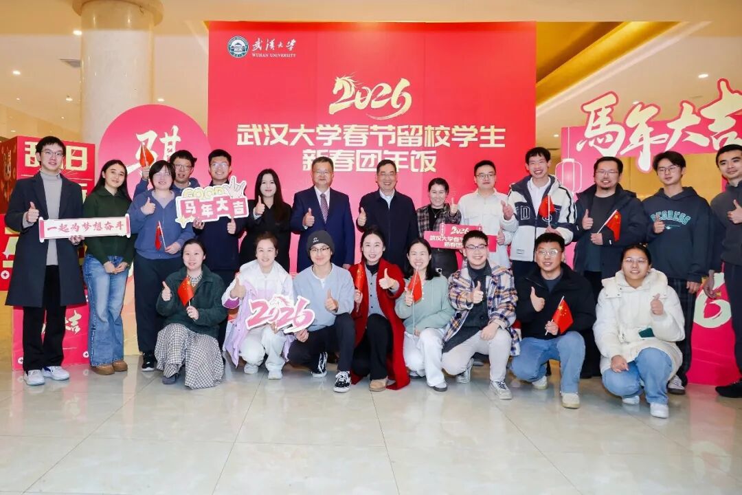 在这个寒假,湖北多所学校面向留校学生组织了团年饭。手写春联,打卡合影……腊月二十七,年味满溢珞珈山。温馨的珞珈山庄、杏林食堂、枫园食堂红灯笼高挂,一派祥和喜庆氛围。武汉大学校长张平文、副校长袁玉峰、校党委副书记楚龙强与留校学生欢聚一堂,同吃暖心团年饭、共话新春美好心愿,在欢声笑语中迎接农历丙午马年的到来。