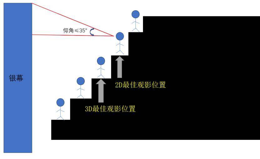 其次,为了避免造成颈椎疲劳,观众与银幕水平线之间的仰角不宜超过35°,示意图如下:
