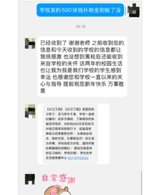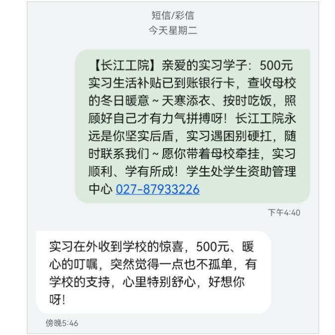 “亲爱的实习学子:500元买习生活补贴已到账银行卡,查收母校的冬日暖意~天寒添衣、按时吃饭,照顾好自己才有力气拼搏呀!长江工院永远是你坚实后盾,实习遇困别硬扛,随时联系我们~愿你带着母校牵挂,实习顺利、学有所成!学生处学生资助管理中心027-87933226”