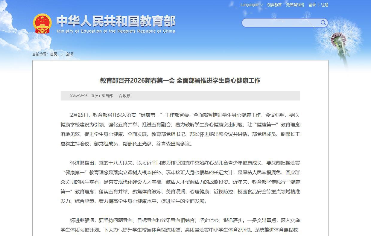 2月25日,教育部召开2026新春第一会,全面部署推进学生身心健康工作,会上明确:深入落实“健康第一”。
