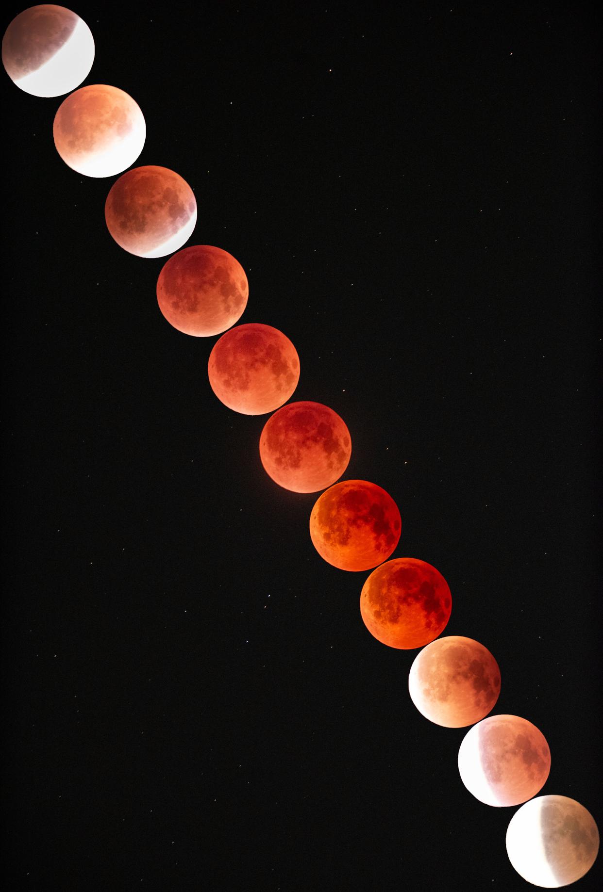 2025年9月7日夜晚至8日凌晨,在北京丰台拍摄的“红月亮”(多张叠加)。新华社发(王磊 摄)