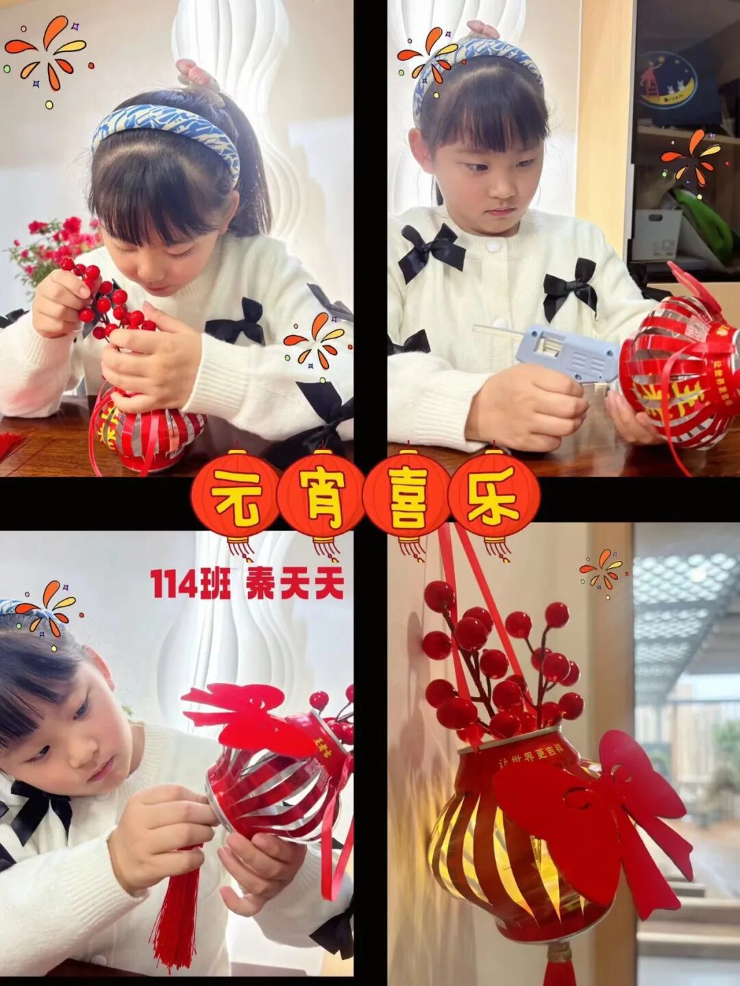 宝贝们化身小小工匠,剪一剪、粘一粘,小马灯、红包宫灯、卡通灯齐亮相,每一盏都藏着奇思妙想,举着自制花灯的小宝贝,眼睛亮过花灯,动手又环保,太赞啦!