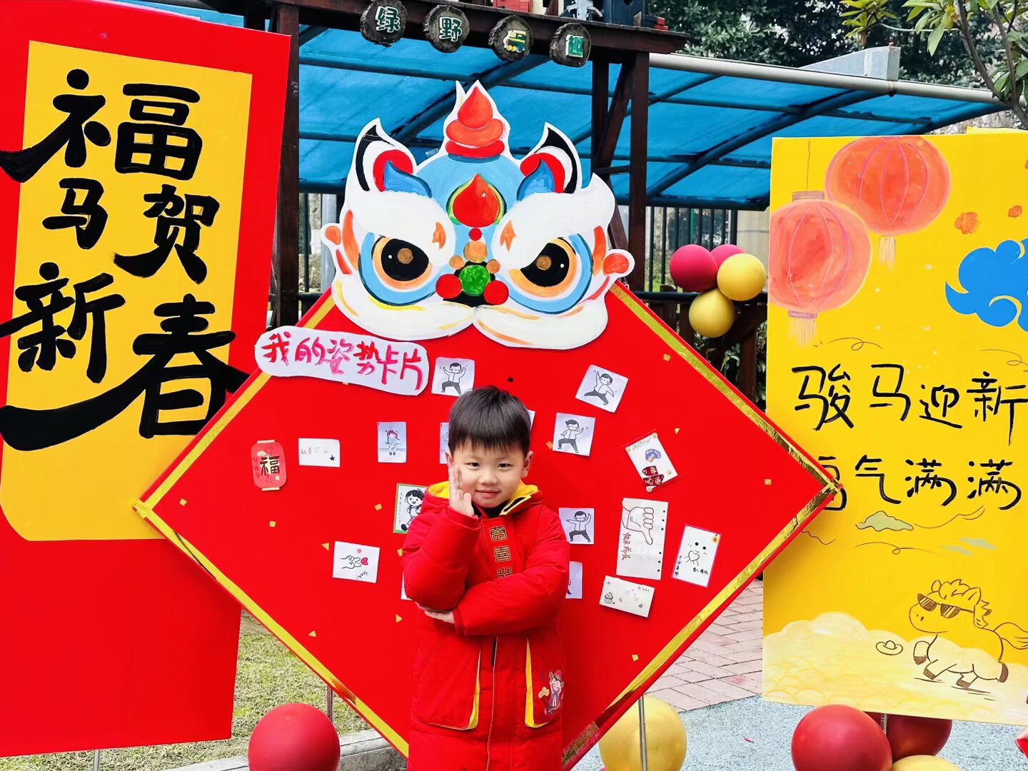幼儿园被中国红、金色与马年、笑脸元素装点得温馨又喜庆,园门的笑容打卡背景板、彩虹跑道旁的哈哈镜互动区、大厅的“姿势能量站”,一入园就沉浸在轻松愉悦的氛围中,感受满满的开学仪式感。在笑容打卡区,幼儿们用竖大拇指、比耶、张开双臂、热情拥抱、单脚站立等多样姿势完成打卡,还参与了好运投递、姿势卡片制作、大笑挑战等活动。这些身体姿势,都是孩子的“情绪标签”,竖大拇指是自信的表达,拥抱是友爱的传递,单脚站立是健康的彰显,孩子们将内心的自信、快乐、友爱与健康,通过身体语言尽情抒发,也在这个过程中完成对自我情绪的认知与表达。
