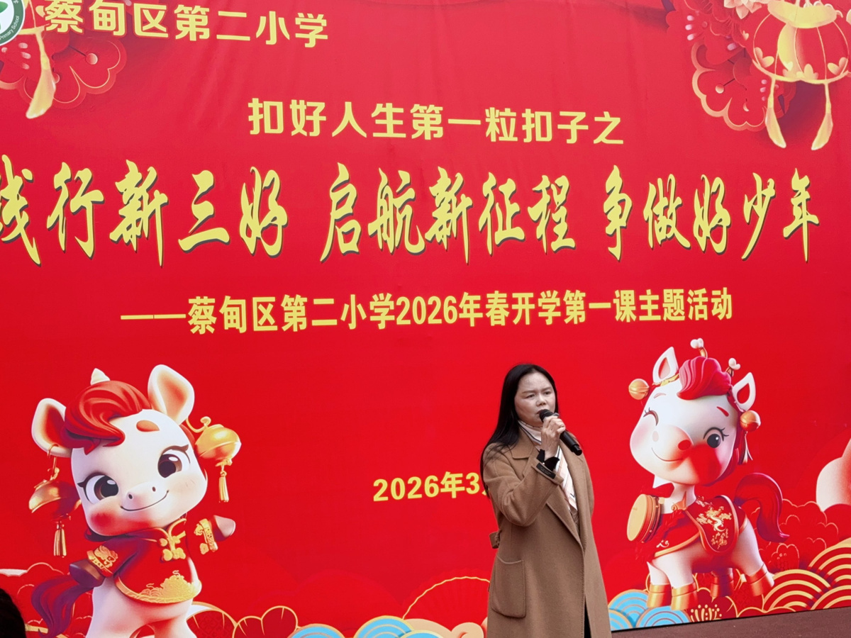 在热烈的掌声中,许会荣校长发表了热情洋溢的新学期寄语。她首先代表学校欢迎全体师生平安归来,并回顾了过去一年学校取得的丰硕成果。结合马年的美好寓意,许校长以“一马当先”“龙马精神”勉励全体同学,在新学期里要发扬吃苦耐劳、勇往直前的精神。她深入浅出地阐释了“德、智、体、美、劳”五育并举的深刻内涵,鼓励大家要争当全面发展的新时代好少年。同时,许校长着重强调了“安全护航”的重要性,叮嘱全体师生时刻将安全牢记心间,在“启新程”的道路上跑出蔡甸二小的加速度。