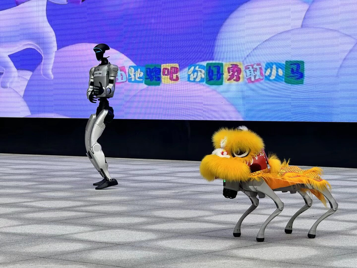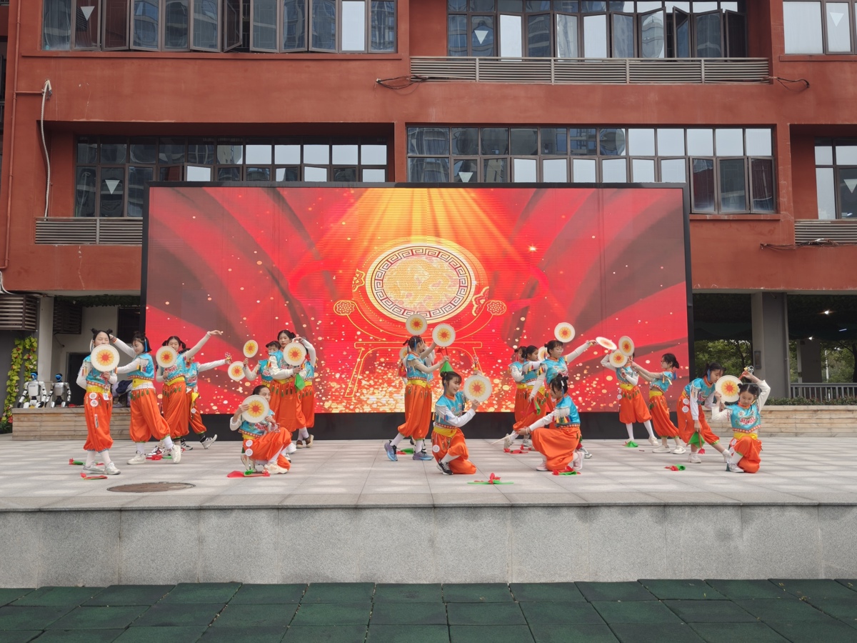 随着典礼正式开始,太平鼓舞与机器人表演先后登场、各展风采。一边是鼓声阵阵、红绸翻飞,学生们在传统舞步中展现非遗文化的深厚底蕴;另一边是机器人与机器狗列阵起舞,以动感十足的动作与智能互动点燃全场热情。传统非遗与现代科技在同一舞台交相辉映,让传统文化在创新的表达中焕发新生,也在学生心中厚植起文化自信。