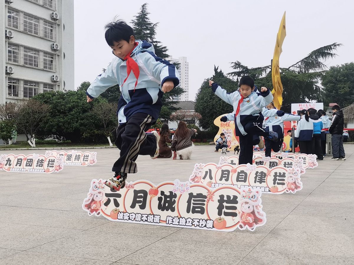 校园广场上以12个月份的主题目标为引导,打造出独具特色的“成长逐梦跨栏道”。教师们用镜头记录下了学生们迈着轻快的步伐踏上跨栏道,完成“跃马迎新”跨栏仪式。