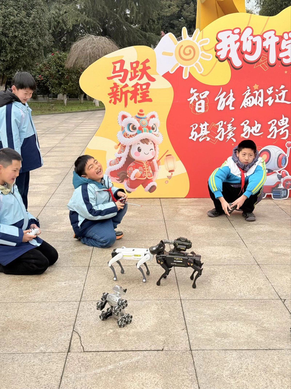 与此同时,各年级组学生在智能展示专属区域就位,遥控汽车、机器狗、智能机器人、无人机……各类智能产品整齐摆放,小小“科创达人”们认真调试设备,为同学们展示手中的科创产品,引发一阵阵欢呼。