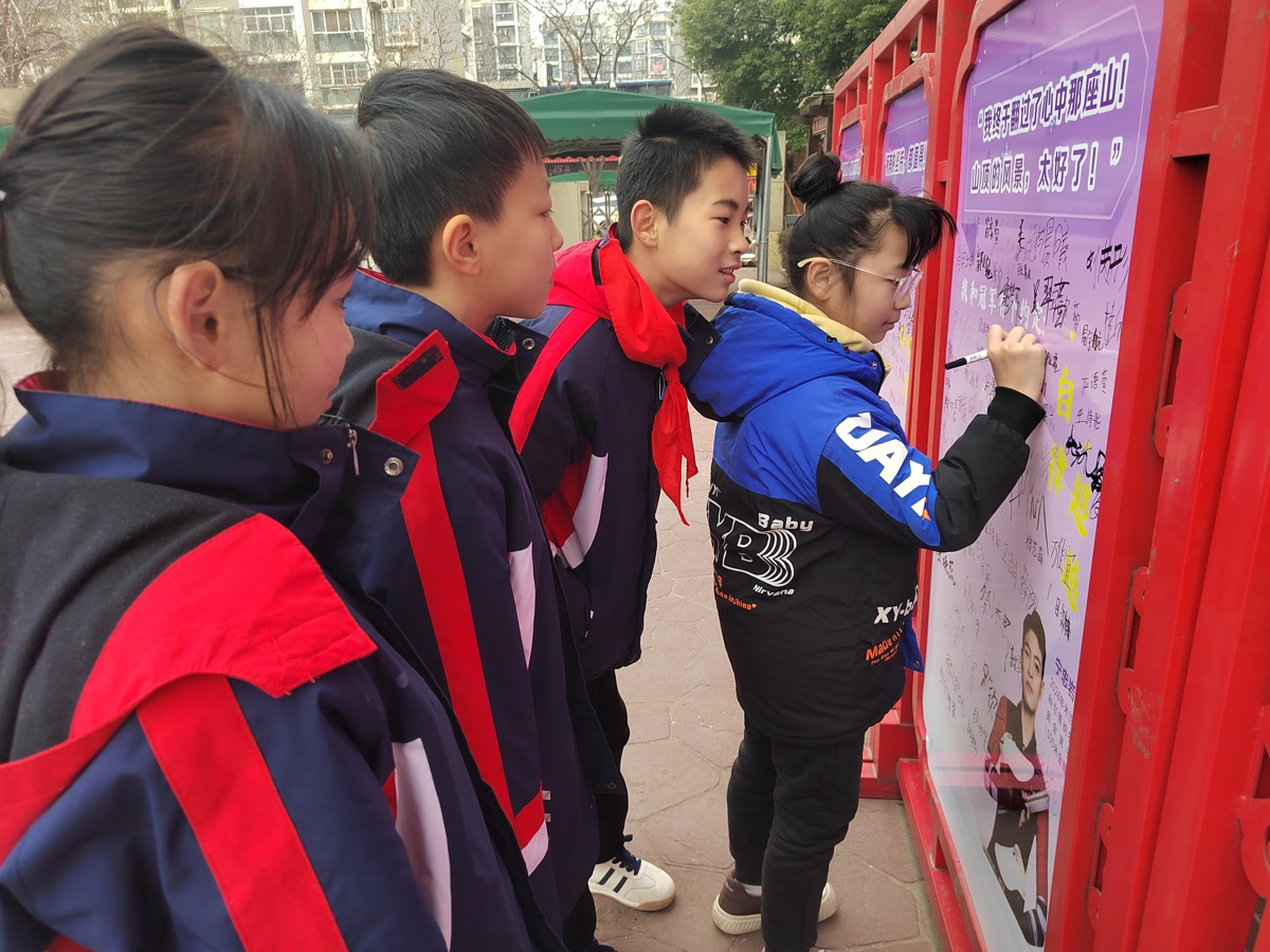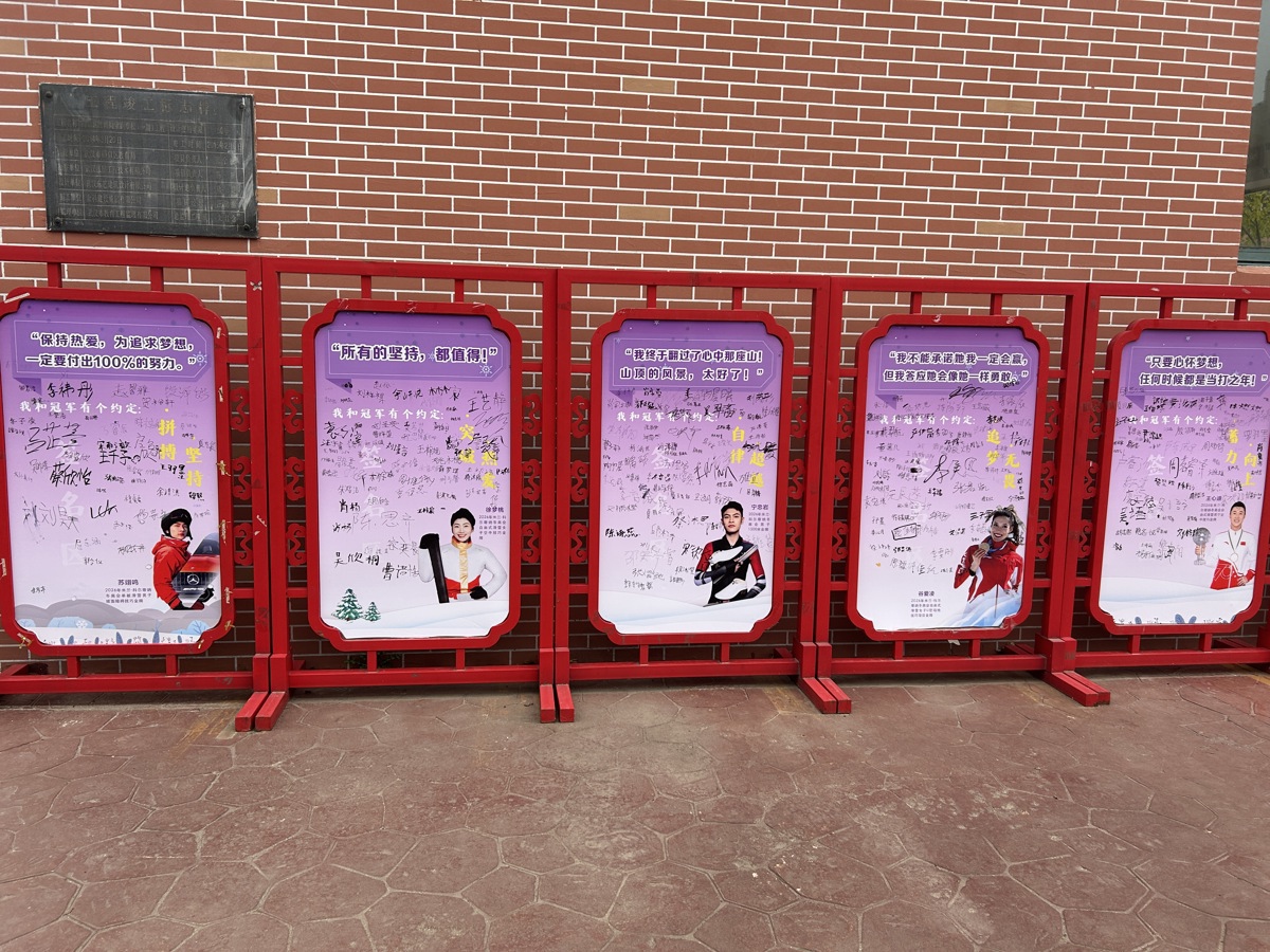 在刚刚落幕的2026年冬奥会上,中国代表团五位运动员勇夺金牌。紫润小学以此为契机,设置了五面奥运冠军墙,生动展现“拼搏”“坚持”“超越”等冠军精神。同学们纷纷驻足,郑重签下自己的名字,表达学习冠军精神、立下新学期奋进誓言的决心。四年级(6)班张珏宸看着展出的作品自豪地说:“认真做好每一件小事,就是在向冠军靠近。”四年级(5)班魏一涵说,要把冠军的坚持精神融入到劳动中,勤动手、乐奉献,在实践锻炼中健康成长。