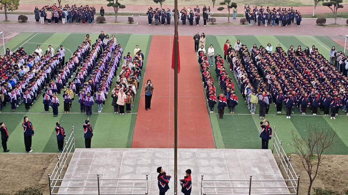 8时20分,开学典礼正式拉开帷幕。伴随着雄壮的国歌声,五星红旗冉冉升起,全体师生肃立注目、庄严敬礼,浓浓的家国情怀与昂扬的奋进力量在校园里激荡。