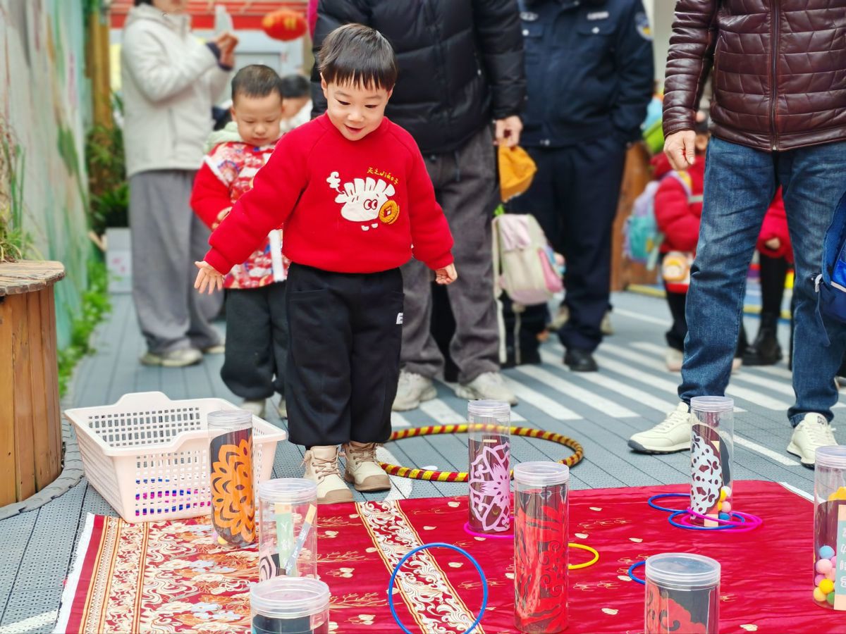 室内游戏区,“新年抢福”正在进行比拼。孩子们两人一组,将印有福字的纸杯快速挪动到指定板凳上,争分夺秒中锻炼手眼协调能力。旁边的“马到福来”射箭游戏备受欢迎,孩子们手持小弓,瞄准红包墙上的红包精准射击,射中即可取下红包兑换迎新礼物。