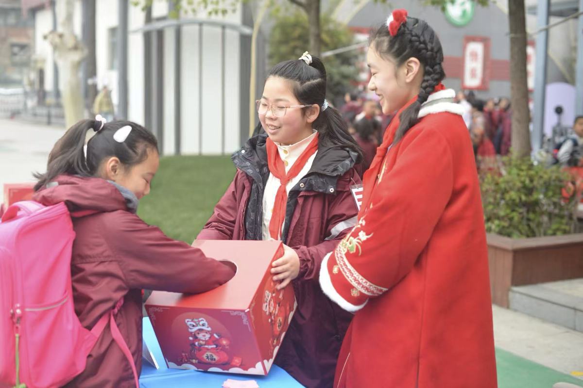 随后,孩子们将自己与家长共同书写的“福”字张贴在展示板上。展示板设在教学楼前,上面贴满了形态各异的福字,形成一面“福气墙”。该环节为“马上有福·把爱贴心间”,意在通过亲子协作传递祝福。