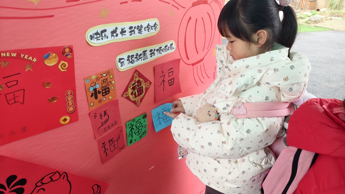 春天里园区则以马年为契机,打造喜乐祥和的开学氛围。萌娃们化身小小祝福使者,通过“拍拍福气”的趣味互动,收获新年好彩头;在“抽取马年上上签”环节,孩子们手持写满美好期许的签文,稚嫩的脸庞上洋溢着纯真的喜悦;贴福字环节更是氛围感拉满,孩子们亲手将红彤彤的福字贴在园区各处,用指尖传递祝福,让“福起马年、福满校园”的美好愿景扎根心中,在动手实践中开启马年成长新篇章。