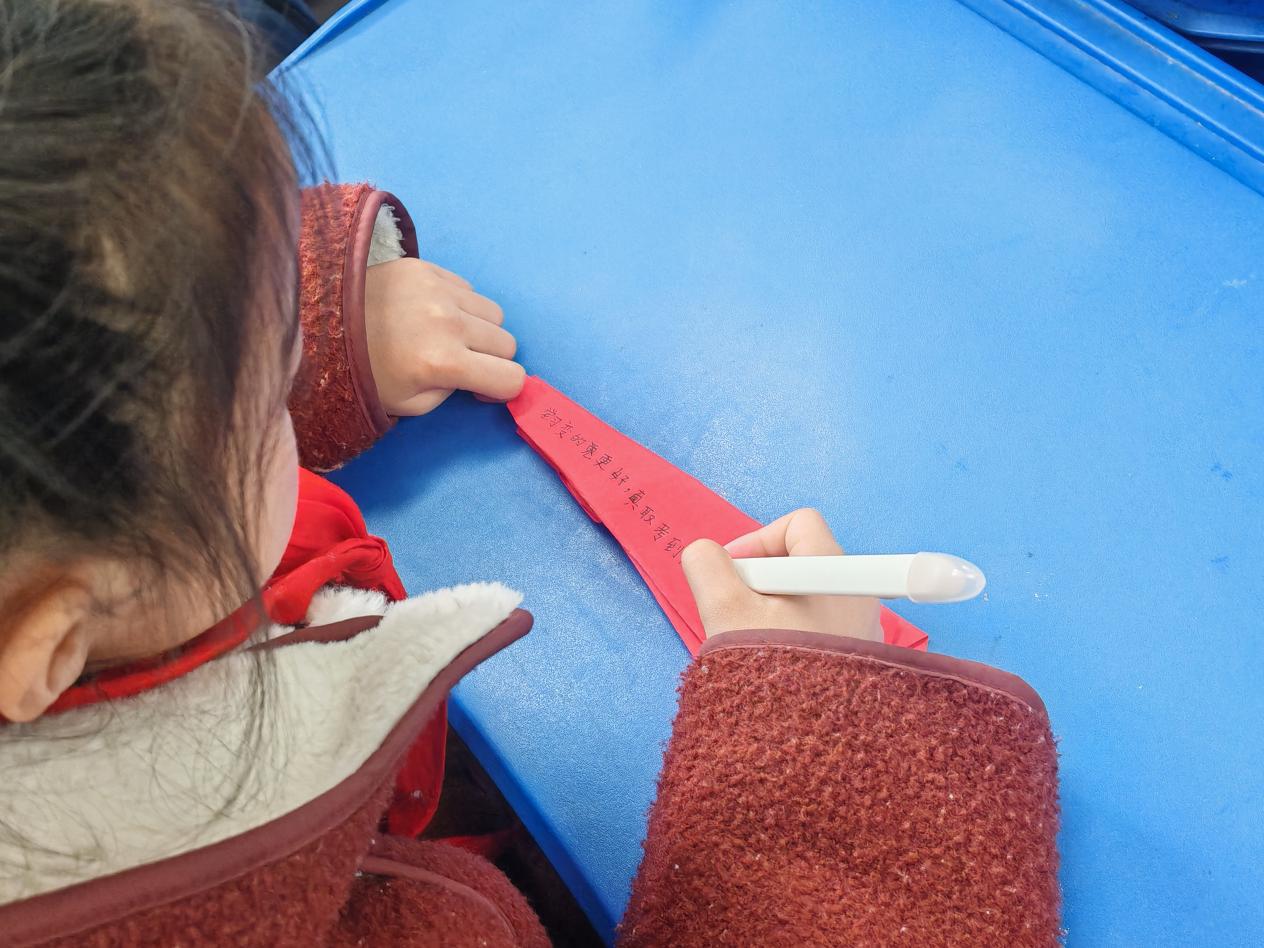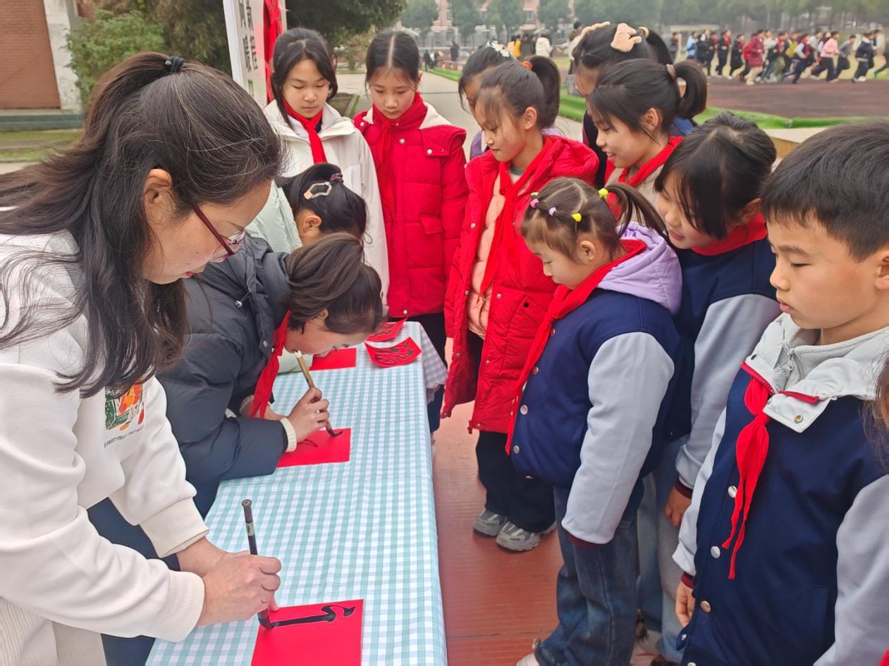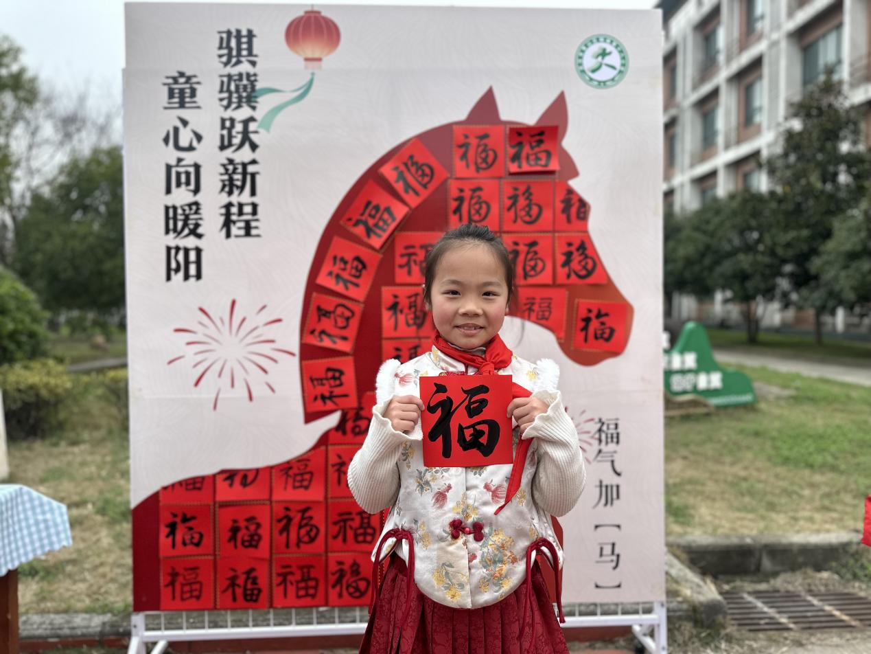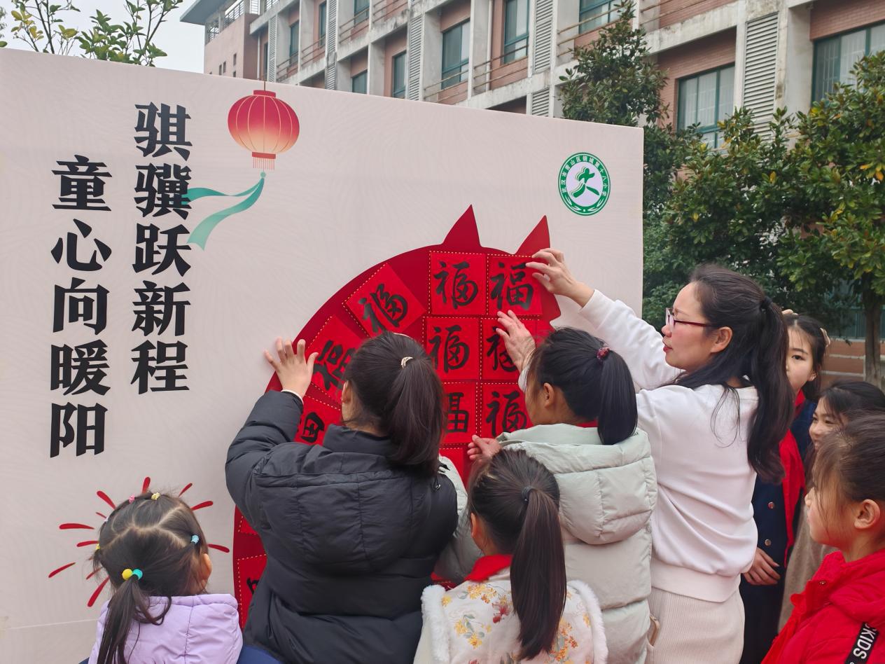 跨栏旁的主题展板前同样热闹,师生携手提笔书写福字,一张张红彤彤的福字错落粘贴,拼成灵动的骏马造型,福气加“马”的美好期许在笔墨间传递。大家看着亲手拼出的“福马”,忍不住拍手叫好:“福气加‘马’,新学期一定超棒!”