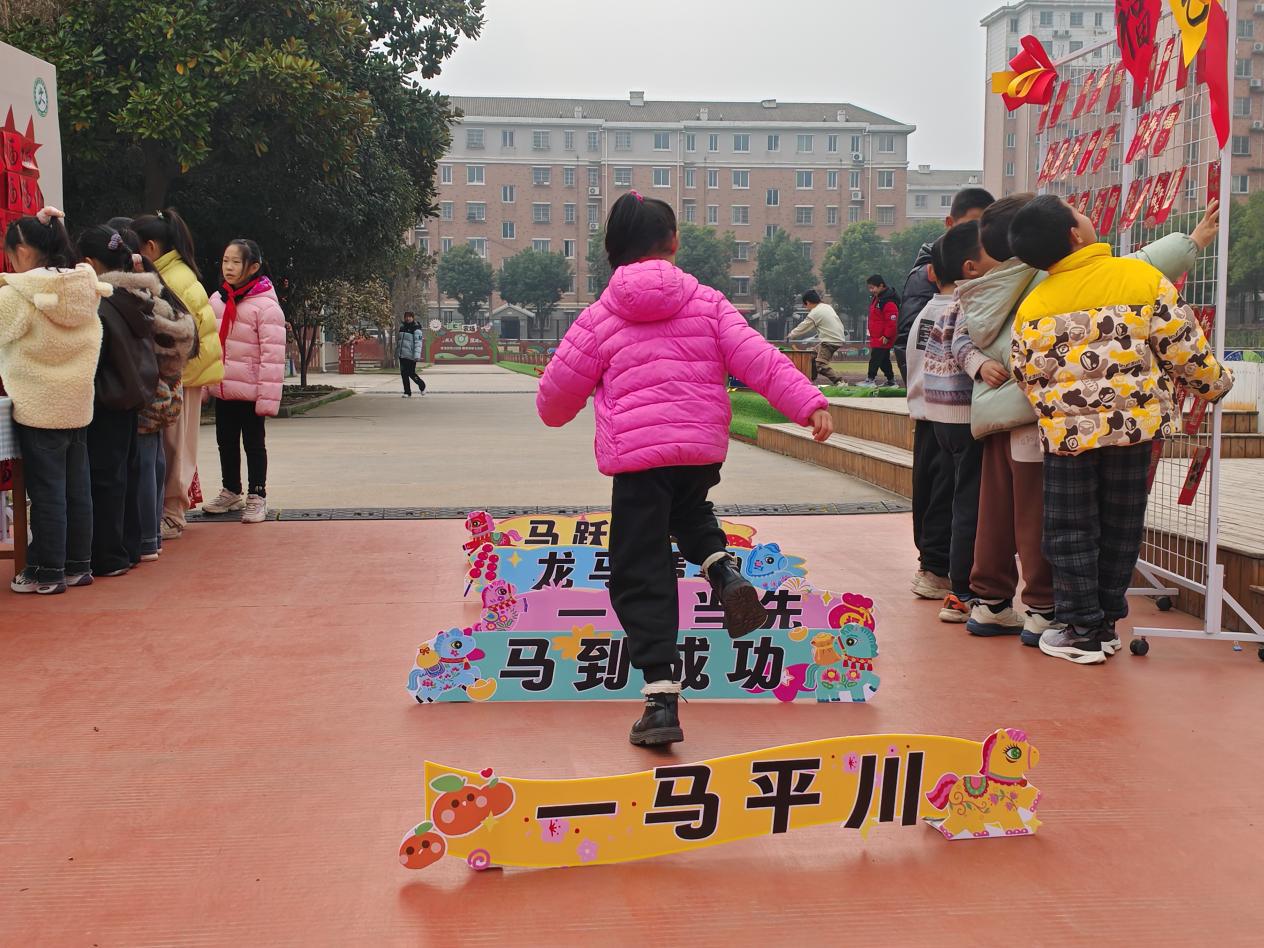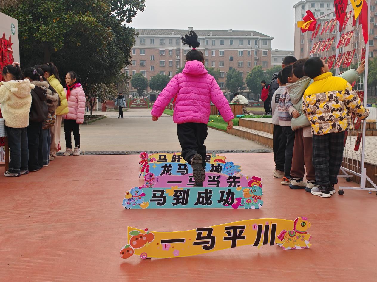 返校首日,校门口到操场的沿途变身“跃马踏春”欢乐主场,马年专属开学仪式感直接拉满。“马到成功”“龙马精神”“一马当先”的低矮跨栏排成趣味“跃马栏”,同学们蹦蹦跳跳跨过栏杆,一个个小脸上满是雀跃。“跨过去就是新学期啦,我要一马当先,学习更努力!”三年级的同学边跨边大声说着,稚嫩的话语里满是昂扬,跨马入校的独特体验让大家兴致勃勃。