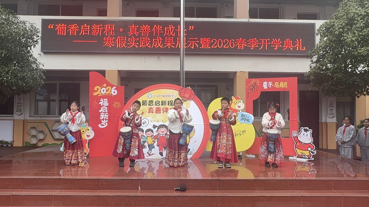 颁奖刚结束,操场上突然锣鼓喧天。“竹板一打响连天,消防安全记心间……”小天使广播站成员用自创的“消防三句半”带来别样表演,把安全知识编成段子,逗得大家哈哈大笑,也把寒假成果展示推向了新高潮。