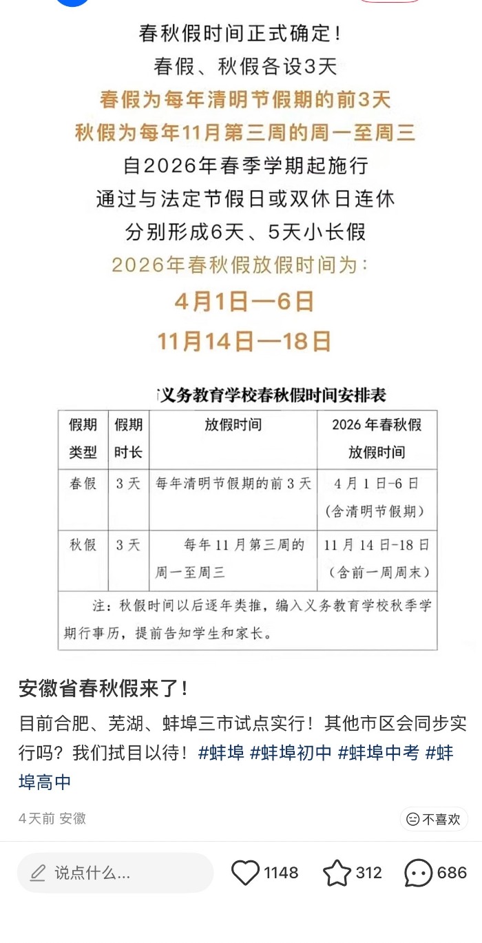 相关信息声称:“春假、秋假各设3天。其中,春假定为每年清明节假期的前三天,秋假为每年11月第三周的周一至周三。自2026年春季学期起施行,通过与法定节假日或双休日连休,可分别形成6天、5天的小长假。2026年具体放假时间为:4月1日—6日,11月14日—18日。”此外,还有消息称,“合肥、芜湖、蚌埠三市将作为试点城市率先实行”。