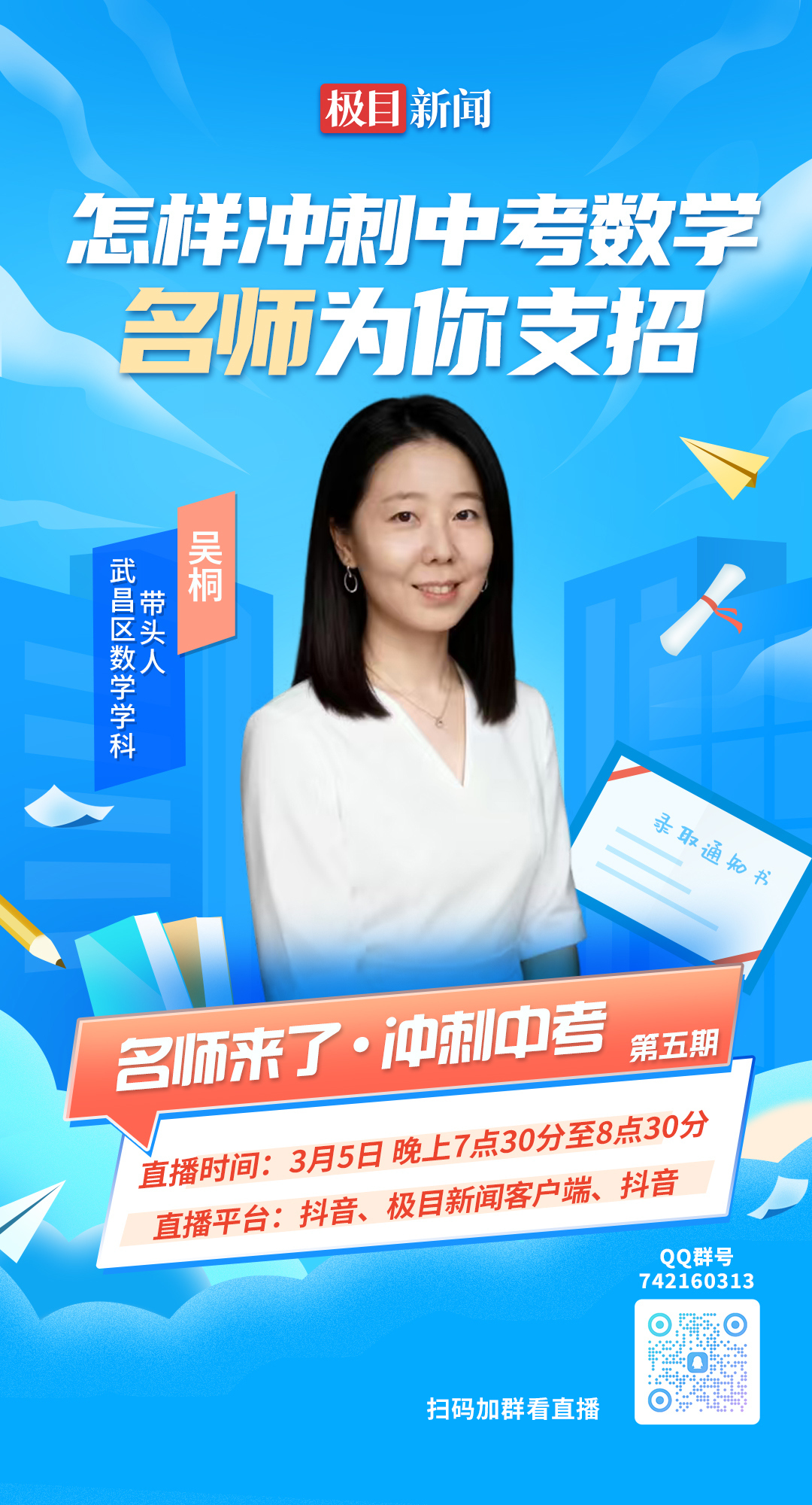 为帮助广大中考生科学备战中考,新闻特别推出“名师来了・冲刺中考”系列公益讲座节目,邀请多位武汉学科名师,通过视频直播的形式为考生和家长提供精准指导。本期节目主讲嘉宾是武汉中学初中部吴桐老师,3月5日(周四)19:30,节目将在新闻抖音号和客户端(APP)同步播出。