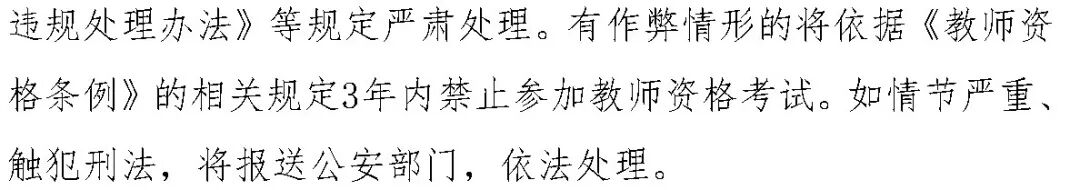 3.考生违纪作弊行为,将被依法依规严肃处理。发生违纪情形的,将取消当次该科目考试成绩;发生作弊情形的,除取消当次所有科目考试成绩外,将依据《教师资格条例》的相关规定,进行“3年内禁止参加教师资格考试”的追加处罚;情节严重触犯刑法的,将报送公安部门依法处理。