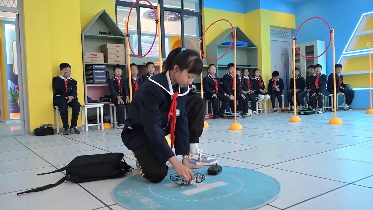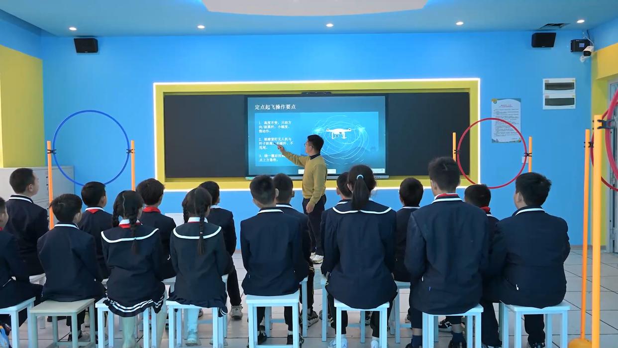 课堂上,授课教师结合小学生认知特点,讲解无人机知识,演示基础飞行动作,学生分组实操练习。