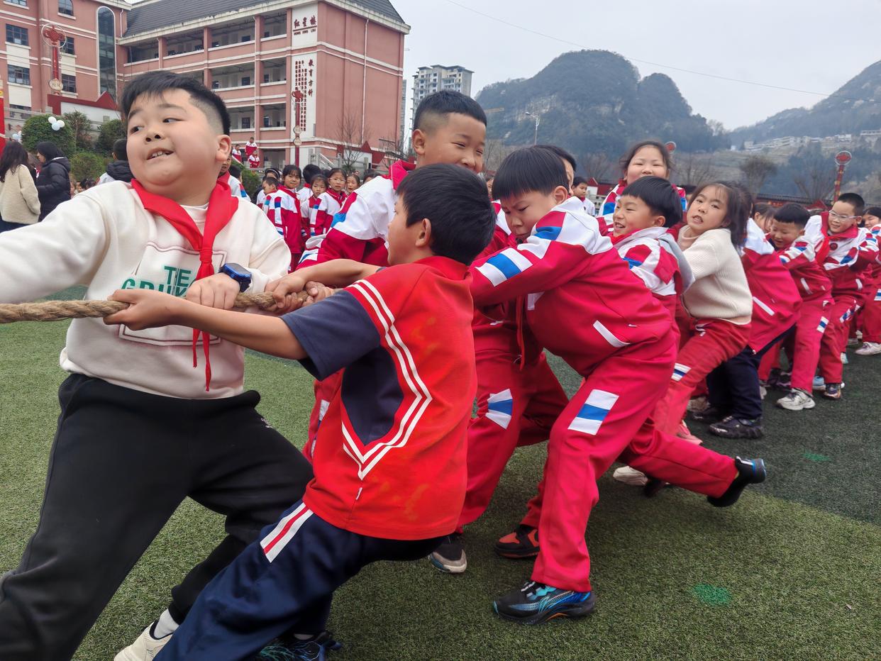 在织金县第八小学开学趣味体育活动中,学生们正在拔河。 受访者供图在贵州其他市州的一些校园内