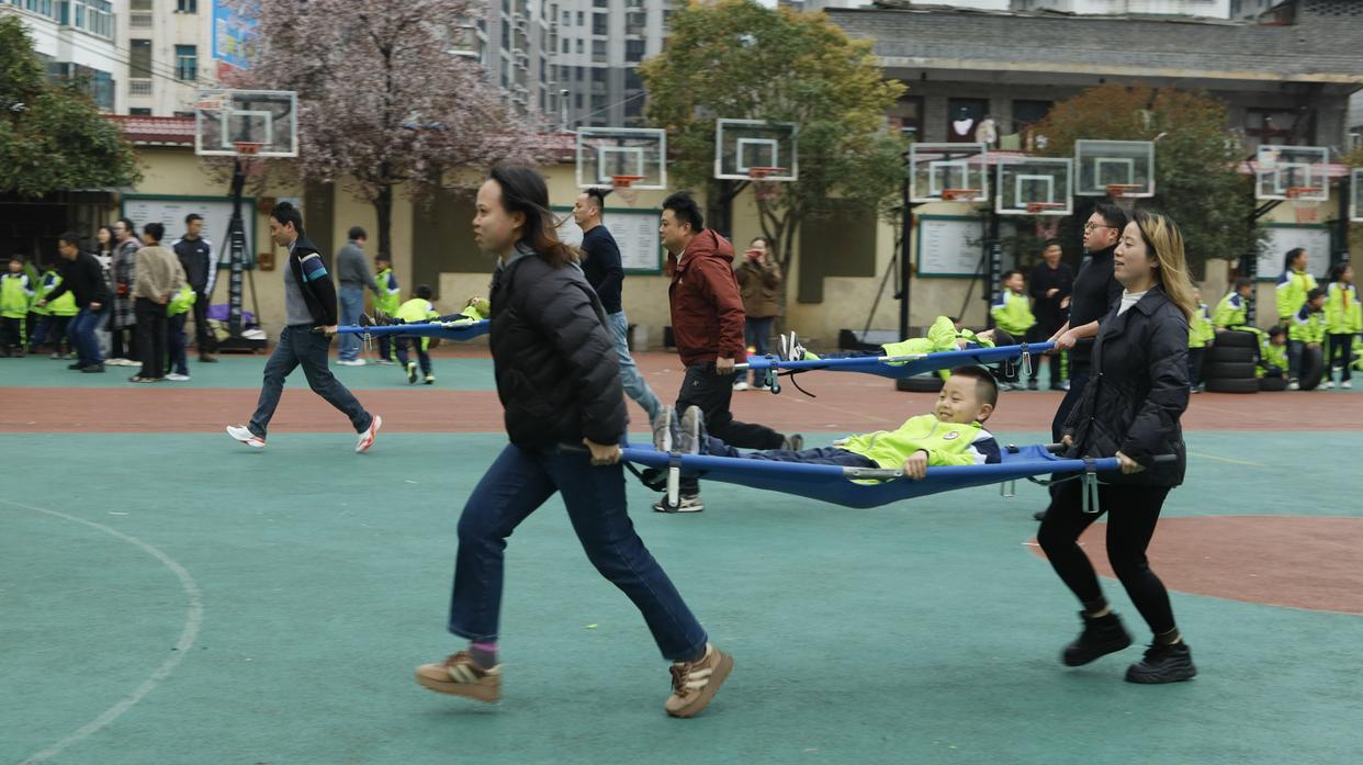 在“开学嗨两天”趣味运动会上,家长在参与“抬小猪”项目。受访者供图每学期开学