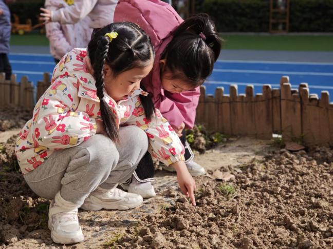 在幼儿园小农场,家长志愿者全程协助,孩子们分组协作,认真完成放土、播种、覆土、浇水等工作,为小种子立上种植牌,种下春日希望。
