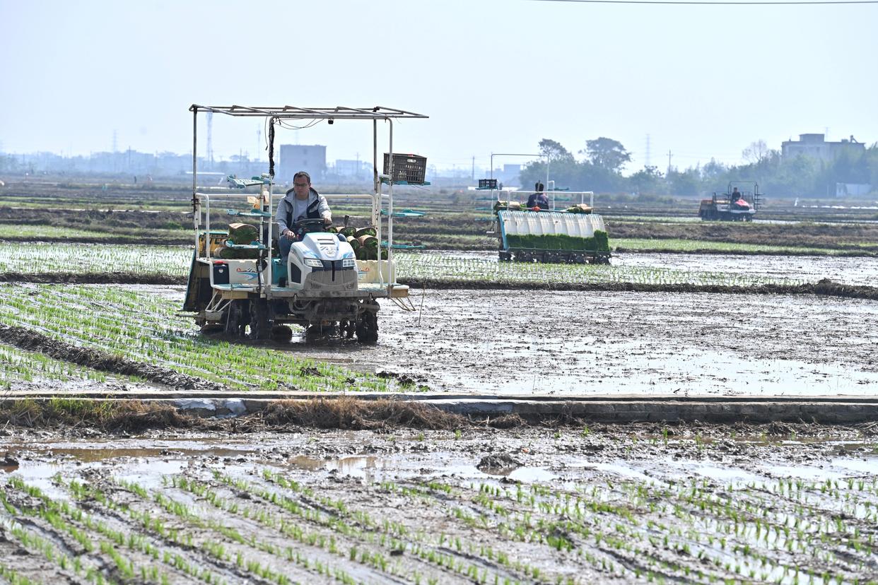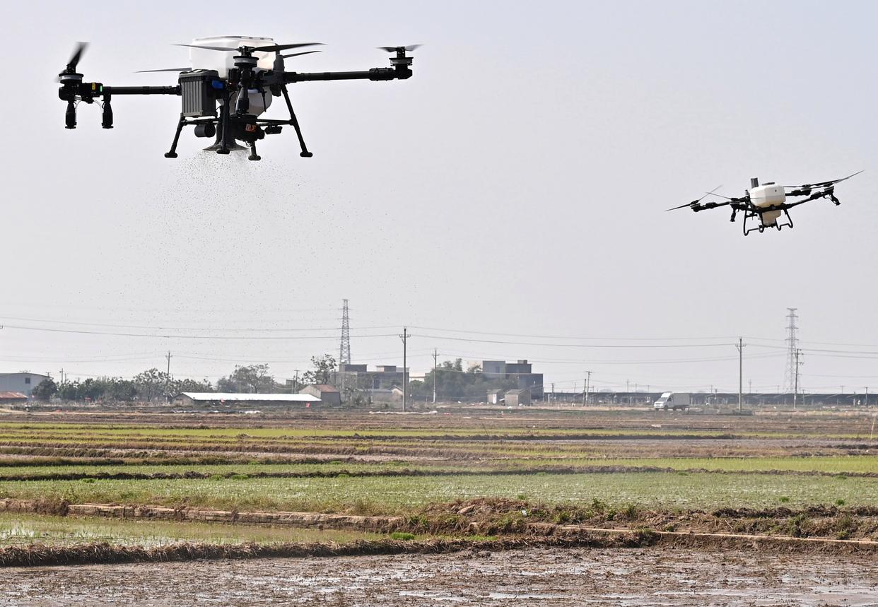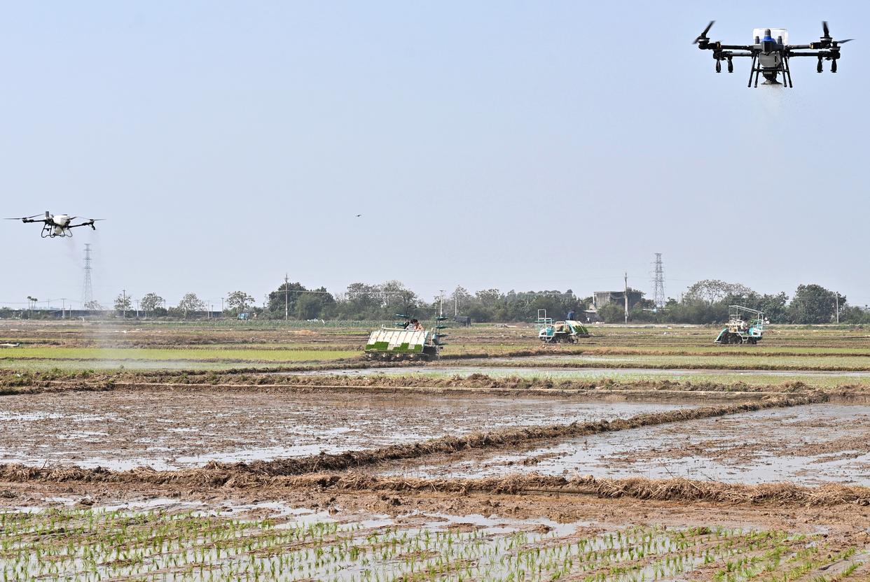 3月12日,植保无人机和插秧机在广西合浦县西场镇田间作业。新华社记者 周华 摄