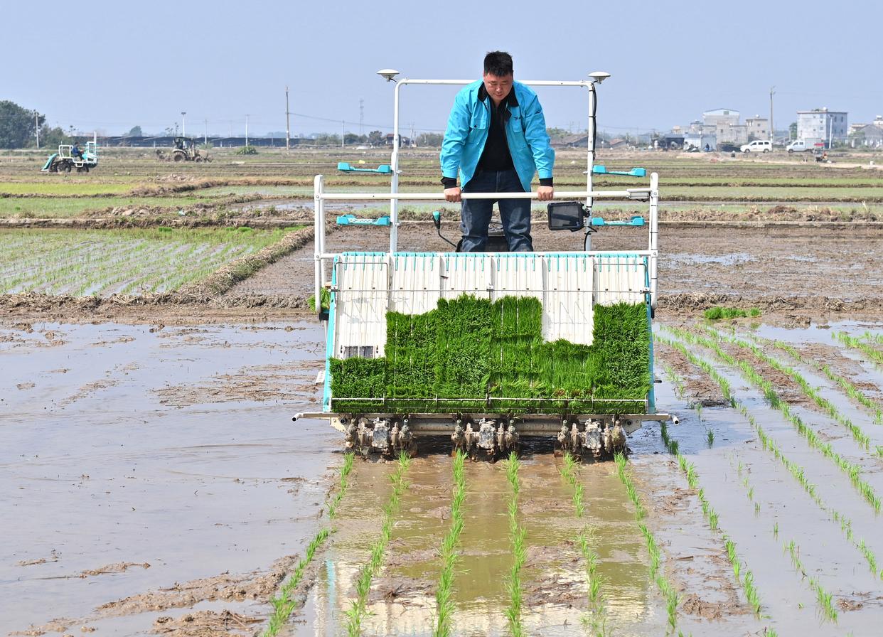 3月12日,工作人员操作插秧机在广西合浦县西场镇田间作业。新华社记者 周华 摄