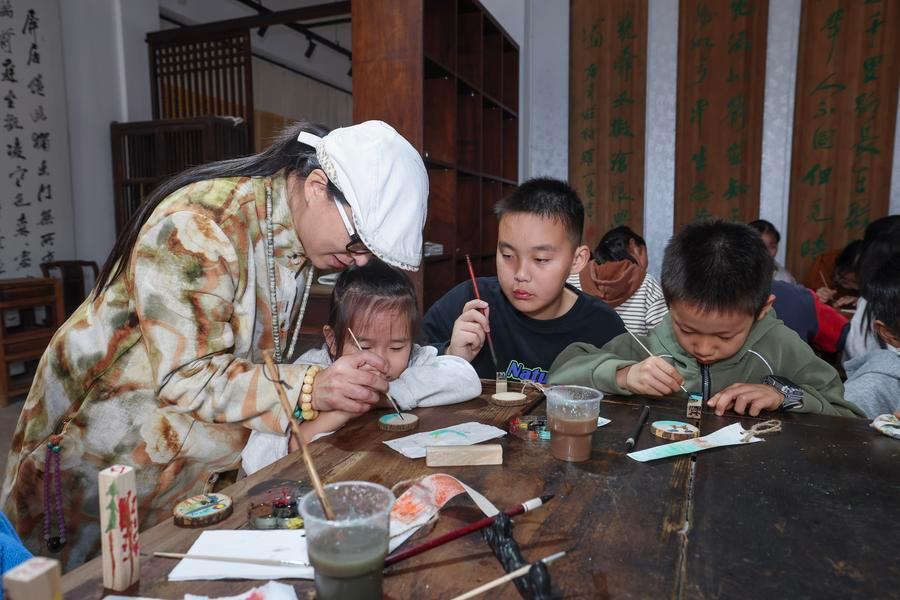 浙江省湖州市长兴县泗安镇,国家一级美术师李希玲(左一)指导学生们在木条上进行绘画创作。新华社记者 徐昱 摄