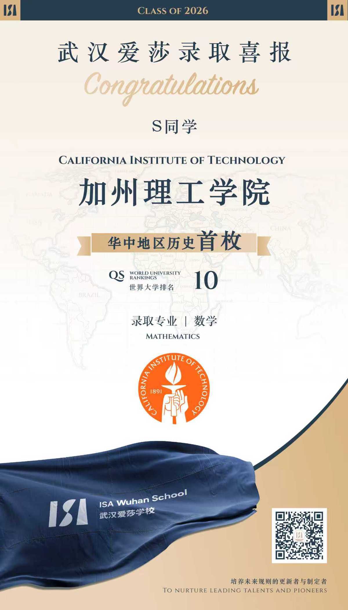 2026美本常规申请季,武汉爱莎学校孙同学收到美国加州理工学院数学专业录取通知。这所QS世界排名第10、被誉为全球理工领域巅峰的学府,百余年间培养了钱学森这样的科学巨匠,以及74位诺贝尔奖得主。每年,能够叩开其大门的中国学子屈指可数。