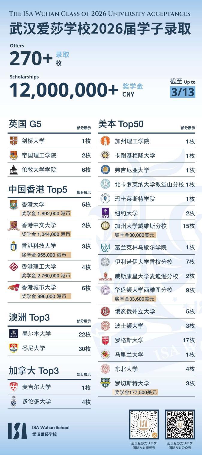 这不是个案。办学仅三年半,武汉爱莎学子已在众多国际国内学术竞赛中崭露头角。2024和2025连续两年在“全球院士论文大赛”中名列前茅;继2024丘赛决赛全球银奖后,2025年持续揽获丘赛决赛计算机全球第六、普林斯顿数学竞赛Power Round全球第一;从AMC12走向USAMO,从物理碗走向USAPHO……截至目前,2026届毕业生已收获270枚全球顶尖名校录取,获奖学金高达1200万元。