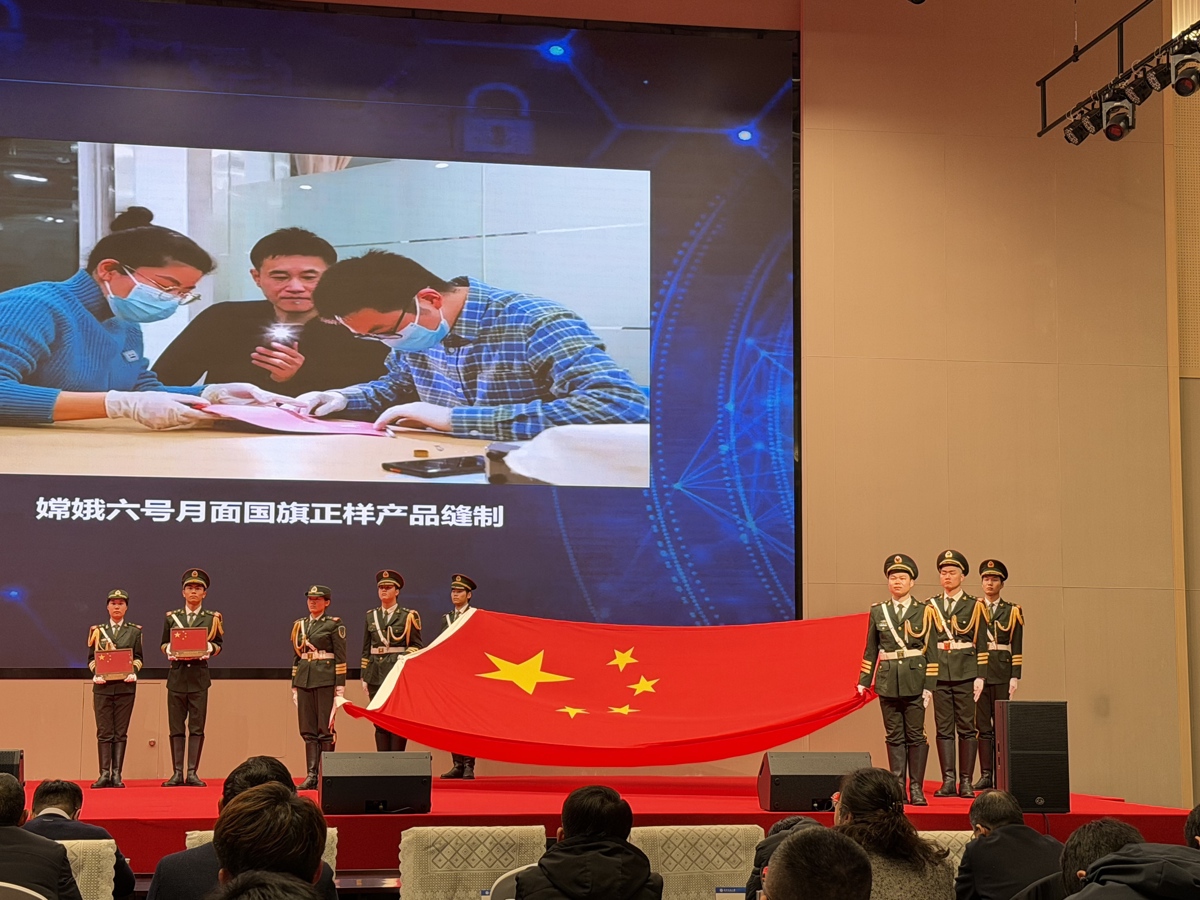 当天9时,仪式正式开始。护旗手迈着铿锵正步,护送天安门广场赠旗与嫦娥五号、六号月面国旗复刻版缓缓入场,全场起立行注目礼,齐唱国歌,现场氛围庄严肃穆。