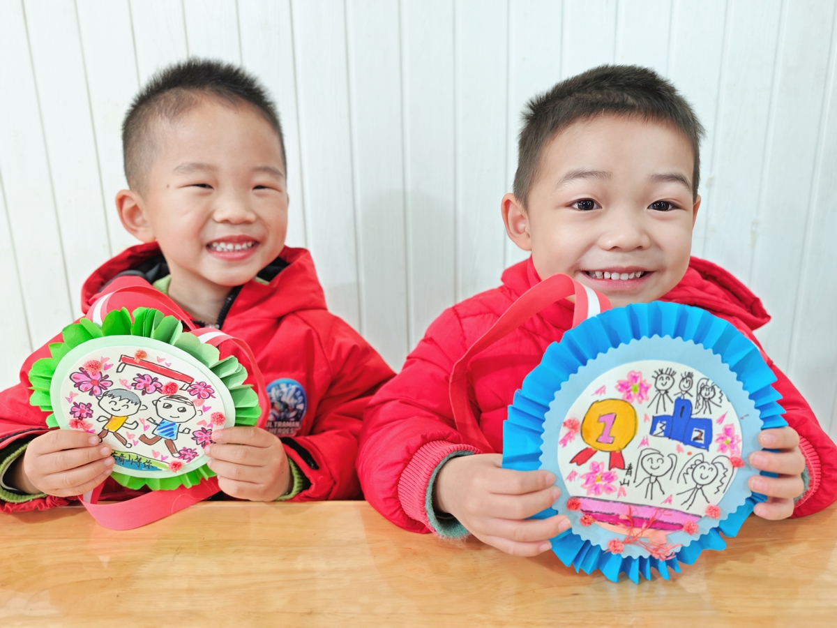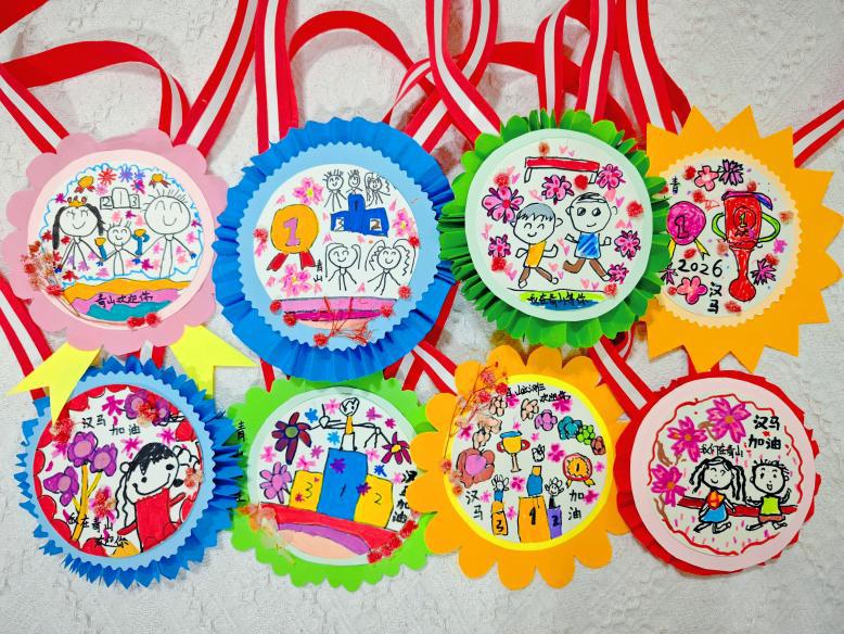 另一边,小小设计师们正忙着“解锁”专属青山汉马奖牌,将樱花元素、青山特色等狠狠拿捏。圆形的硬纸板上,粉白相间的樱花沿着彩虹跑道蜿蜒绽放,卡通小人迈着小短腿奋力奔跑,一旁还清晰勾勒出青山江滩、长江大桥的轮廓,有的小朋友还在奖牌边缘贴上了仿真樱花瓣,认真地说:“这是我送给跑完全程的叔叔阿姨的,既有青山的樱花,又有我们的心意,他们都是最厉害的英雄!”这些带着奶气的手工奖牌,没有精致的做工,却藏着最真诚的敬意和最浓的青山情怀,即将成为汉马青山樱花跑道冲线时刻,最特别的暖心惊喜。