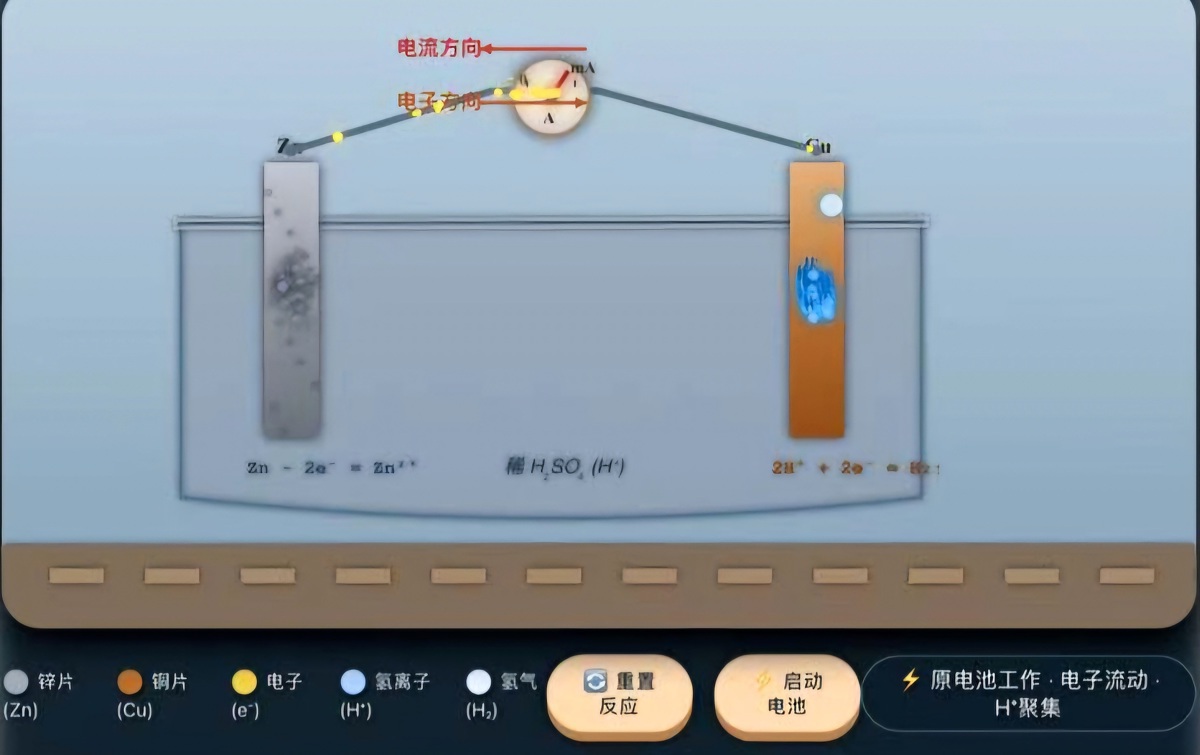 该班另一位同学孙莺予则把目标对准了难懂的铜锌原电池。“预习时觉得太抽象,我想通过动画把它变清楚。”创作初期并不顺利,用AI生成的视频多次“跑偏”。更换工具、调整框架、优化细节……她一步步完善动画网页,从装置搭建到电流表偏转,再到氢离子在铜片表面聚集,终于让微观过程清晰呈现。