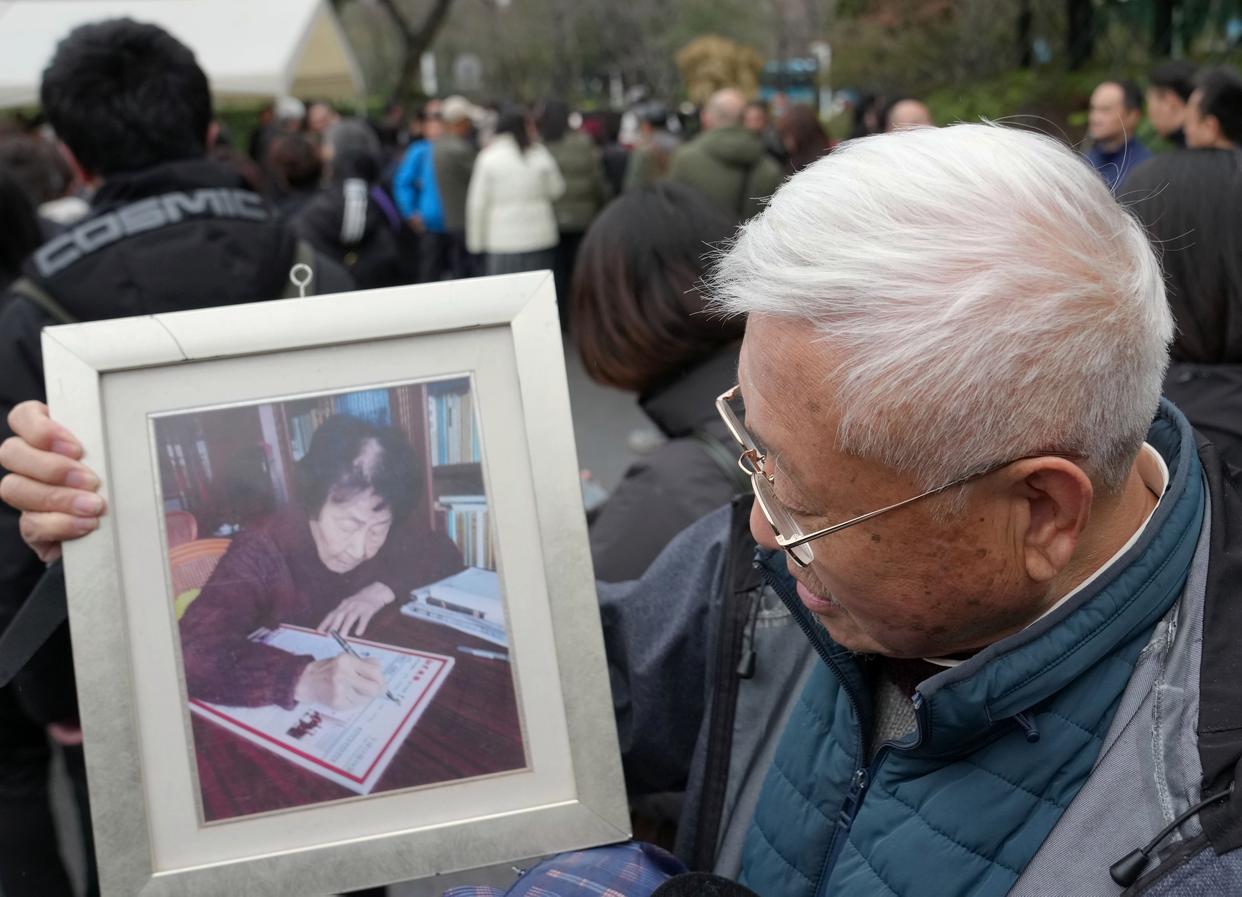 3月18日,一名市民捧着于漪老师的照片前来送别。新华社记者 刘颖 摄